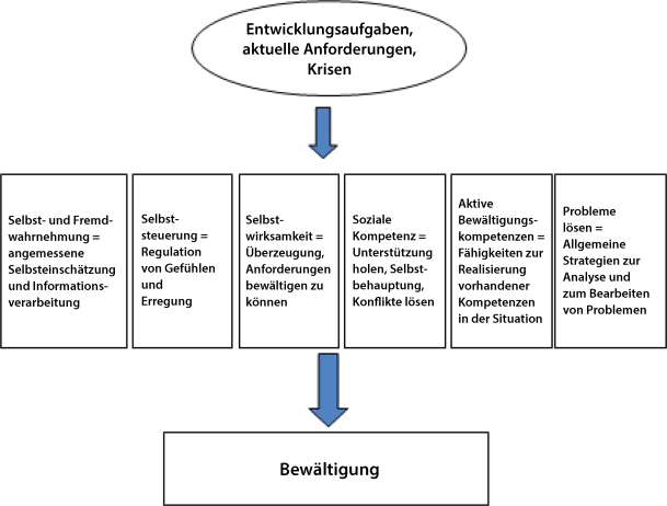 In einer weitergefassten Definition wird Resilienz als eine Kompetenz verstanden, die sich aus verschiedenen Einzelfähigkeiten (den Resilienzfaktoren, siehe unten) zusammensetzt (vgl. z. B. Rönnau-Böse und Fröhlich-Gildhoff 2012). Diese Kompetenzen sind nicht nur relevant für Krisensituationen, sondern auch notwendig um z. B. Entwicklungsaufgaben und weniger kritische Alltagssituationen zu bewältigen. Die Einzelkompetenzen entwickeln sich im Verlauf der Lebensgeschichte in verschiedensten Situationen, werden unter Belastung aktiviert und manifestieren sich dann als Resilienz. Fingerle (2011) verwendet in diesem Zusammenhang den Begriff des „Bewältigungskapitals“: „Über Bewältigungskapital zu verfügen bedeutet, Ressourcen zu identifizieren, zu nutzen und über sie zu reflektieren, um eigene Ziele zu erreichen, das eigene Potential von Problemen und Krisen weiter zu entwickeln und am gesellschaftlichen Leben teilzunehmen“ (ebd., S. 213).