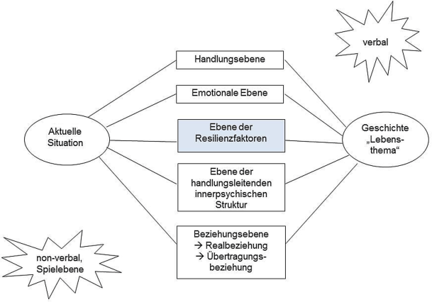 Das zentrale Medium in Kindertherapien ist das Spiel (vgl. besonders Weinberger 2013). KinderpsychotherapeutInnen müssen daher immer „Übersetzungsarbeit“ leisten: Sie müssen das Kind in seiner spielerischen, symbolhaften Sprache verstehen und ‚einordnen‘ und dann wieder verbal oder auf der Spielebene antworten. Das „Übersetzen ist oft gleichbedeutend mit einer Transformation unbewusster Inhalte in Bewusstes, es trägt somit auch zur besseren Verankerung neuer Erfahrungsinhalte bei. Der Therapeut bewegt sich also immer auf zwei Ebenen gleichzeitig: einmal auf der Realebene, zum andern auf der Spiel- bzw. Symbolebene. Damit verbunden sind auch mehrere Rollen: Der Therapeut ist einerseits ein in der Realität verankerter Erwachsener, der Orientierung bietet, er ist aber auch immer Spielpartner bzw. Mithandelnder auf der Symbolebene“ (Fröhlich-Gildhoff et al. 2004, S. 179). Im Folgenden wird erläutert, wie in der therapeutischen (Spiel)Situation die Resilienzperspektive eingebracht wird.