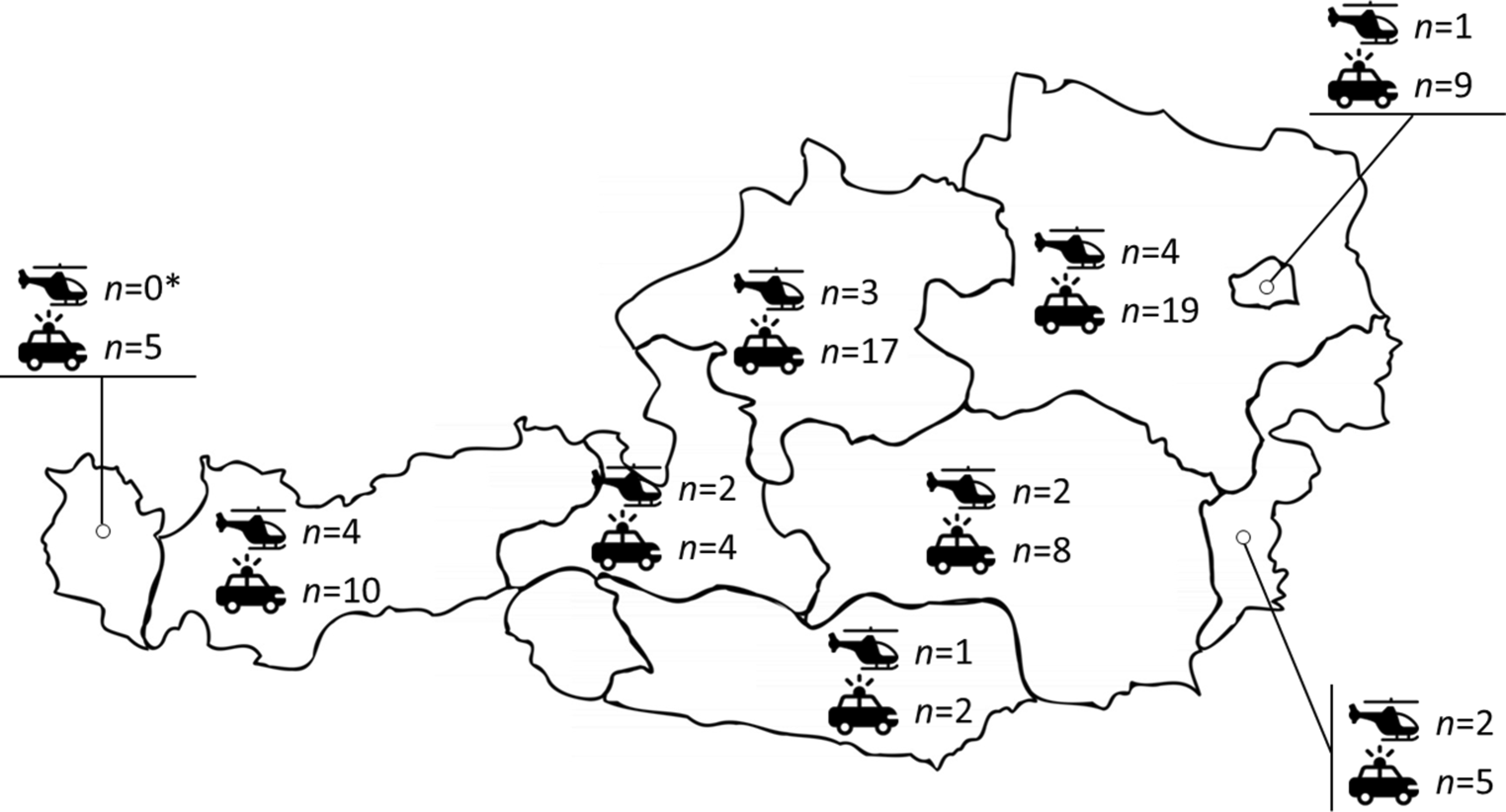 Map of Austria showing the number of participating ground and helicopter emergency medical services in the nine Austrian states. *No HEMS base from the state of Vorarlberg was included into the analysis of the Austrian Emergency Day 2024, as no HEMS call was conducted during the 24 h audit period. Map by vecteezy.com; icons by flaticon.com