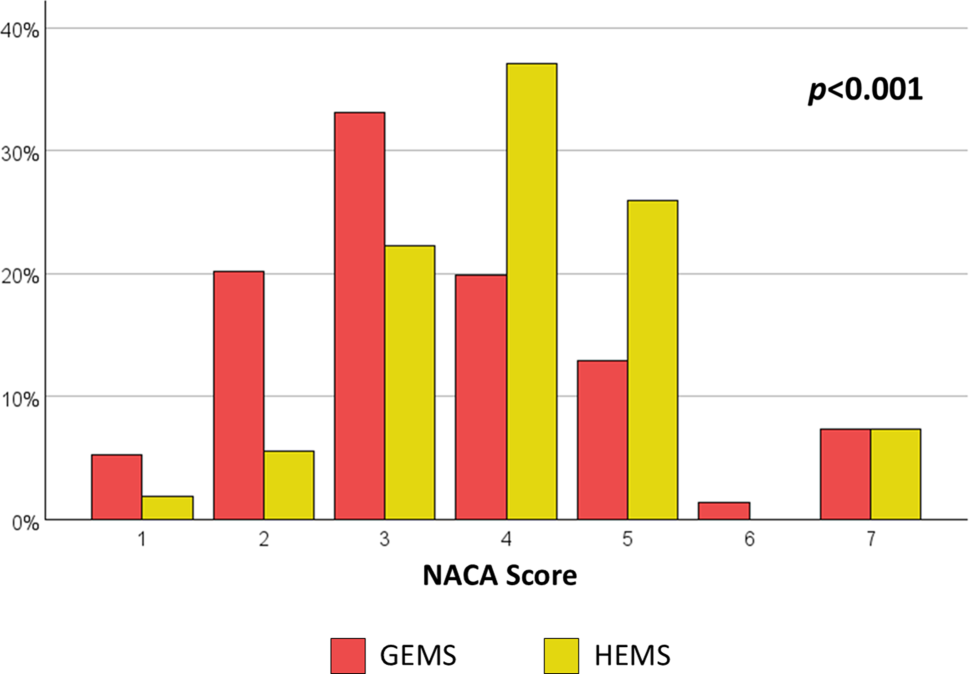 The proportion of primary calls was lower and the proportion of interfacility transfers higher in the HEMS than the GEMS group. The HEMS physicians accompanied patients during transportation to the hospital more often than GEMS physicians. Emergency patients transported by HEMS were more frequently handed over in the resuscitation room, intensive care unit or other hospital sites than patients transported by GEMS. The duration of emergency calls was longer for HEMS than GEMS missions (Table 1). The NACA scores differed between GEMS and HEMS calls (Fig. 2). The median (IQR) NACA score was lower for GEMS than HEMS calls (3 (2–4) vs. 4 (3–5); p < 0.001). Excluding cancelled calls, the rate of over-triage was higher in GEMS than HEMS (171/293 (58.4%) vs. 16/54 (29.6%); p < 0.001). Sonography was used more often by HEMS than GEMS physicians. No difference in the rate of other diagnostic or therapeutic physician-delivered interventions was observed between GEMS and HEMS (Table 2).