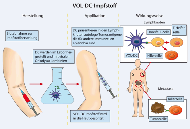 Schema zur Herstellung, Applikation und Wirkungsweise des Impfstoffs VOL-DC. Entnommene Tumorzellen des Patienten werden in Zellkultur mit einem onkolytischen (tumorzerstörenden) Virus infiziert und in Lösung gebracht (lysiert). Zur Herstellung des Impfstoffs wird das Onkolysat nun mit Spezialzellen desselben Patienten (dendritischen Zellen, DC) kombiniert. Die DCs verarbeiten das Onkolysat so, dass bestimmte Bestandteile davon, sog. Tumorantigene, für andere Immunzellen (T-Zellen) erkennbar werden. Zusätzlich vermittelt der Impfstoff wichtige Aktivierungssignale für die T-Zellen. Wirkungsweise: Von der Injektionsstelle der Haut wandern die DCs in den nächstgelegenen Lymphknoten, um dort eine Anti-Tumor-Immunantwort zu initiieren. Naive T-Zellen, die noch nie Kontakt mit einem Antigen gehabt haben, die aber einen Rezeptor haben, der zu einem Tumorantigen passt, werden mit den VOL-DCs interagieren und aktiviert. Sie reifen zuT-Helferzellen oder zu T-Killerzellen, vermehren sich, verlassen den Lymphknoten und suchen den ganzen Körper nach Tumorzellen ab. Haben sie bei einer Metastase die Tumorantigene wieder erkannt, werden die Tumorzellen dort attackiert. Danach patrouillieren tumorantigenspezifische Gedächtniszellen im Körper und überwachen ihn weiterhin gegen Metastasenwachstum
