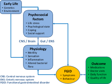 Functional gastrointestinal disorders (FGID) like functional dyspepsia or irritable bowel syndrome are frequent reasons for patient visits to doctors. Depending on their definition, the prevalence of FGIDs in Western countries ranges from 10% to more than 20% [1‐3]. In these patients, diagnostic work-up in the clinical setting does not reveal structural or biochemical abnormalities that can explain the respective symptoms. FGIDs are understood as multifactorial biopsychological phenomena [4]. Thus symptoms are now attributed to a complex interaction of physiologic and psychosocial factors, which are interlinked through the “brain–gut axis” (Fig. 1; [5]). Since 2006, clinicians and also clinical trials most frequently use the Rome III criteria to standardize diagnosis of FGIDs. These criteria classify FGIDs into several categories according to the location of symptoms, the predominant symptoms and the patient’s age. It is acknowledged that complaints may overlap, i. e. that patients may present symptoms of more than one category. In adults, six major domains have been defined: esophageal (category A); gastroduodenal (category B); bowel disorders (category C); functional abdominal pain syndrome (category D); biliary (category E); and anorectal disorders (category F) [5]. This study focused on functional and motility related disorders, which are allocated to the gastroduodenal and bowel (intestinal) domain (categories B and C).