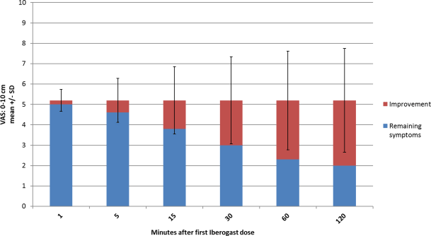 This study demonstrates rapid improvement of symptoms in patients treated with STW 5. An improvement of symptoms was noticeable within 15 min after the first dose, and the majority of patients experienced a relevant improvement within 15–30 min after each STW 5 dose. There was a tendency towards an earlier improvement as therapy continued. Thus there is no evidence for habituation to the treatment effect.