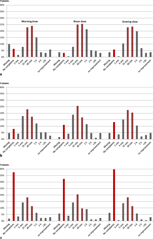 After the first dose of STW 5 on day 1, the patients assessed the severity of their complaints on a 10 cm visual analogue scale (VAS) before and 1, 5, 15, 30, 60 and 120 min after the dose. The ends of the scale were marked with “no complaints” and “severe complaints”. Furthermore, after every dose of STW 5 during the following 8 days, the patients documented the time to marked improvement of their functional gastrointestinal complaints in a patient diary (seven categories: within 1 min, 5 min, 15 min, 30 min, 1 h, 2 h or longer than 2 h).