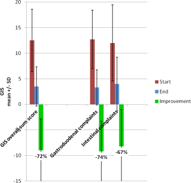 Improvement of gastrointestinal complaints by investigational site: Differences between sites in improvement of gastrointestinal complaints coincided with baseline complaints, in that sites with less severely affected patients found less pronounced improvements. No other patterns appeared.