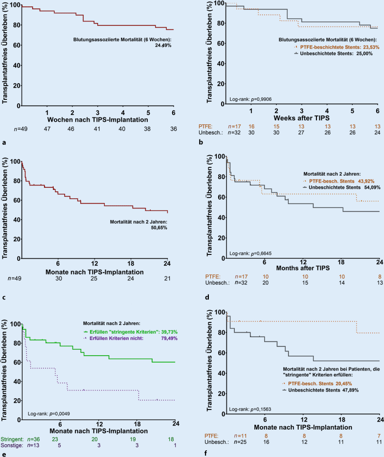 Transplantatfreies Überleben nach Early-TIPS-Implantation. a, b Blutungs-assoziiertes Überleben nach TIPS, c–f Überleben nach TIPS-Implantation