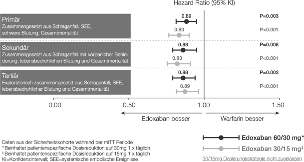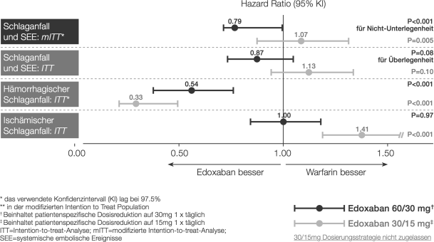 Da gegenüber Warfarin eine zumindest vergleichbare Effektivität hinsichtlich der Schlaganfallprophylaxe anzustreben ist, wurde die niedrigere Edoxaban Dosierungsstrategie (30/15 mg) nicht zur Zulassung eingereicht, und wird in der klinischen Praxis nicht verfügbar sein. Ausschließlich zur Transition von Edoxaban 30 mg auf einen VKA ist Edoxaban 15 mg zusammen mit einem VKA anzuwenden. Nachfolgend wird aus diesem Grund ausschließlich auf die Daten des 60/30 mg Studienarmes eingegangen.