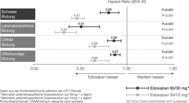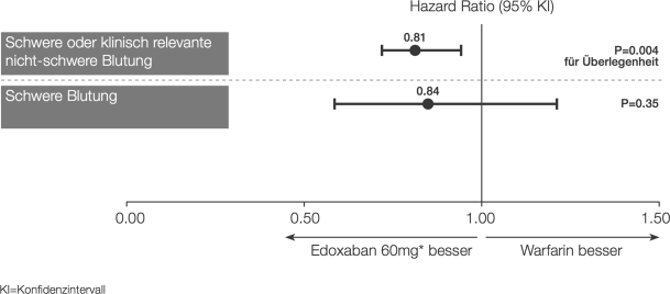 Der kombinierte Effektivitätsendpunkt, bestehend aus ischämischen oder hämorrhagischen Schlaganfall und systemischer Embolie wurde nach durchschnittlich 2,8 Jahren Follow-Up zugunsten von Edoxaban um 21 % gesenkt (RR 0,79, 97,5 % KI 0,63–0,99, p < 0,001 für Nicht-Unterlegenheit in der modifizierten Intention-to-Treat Population (primärer Endpunkt), RR 0,87, 97,5 % KI 0,73–1,04, p = 0,08 für Überlegenheit in der Intention-To-Treat Population) (Abb. 1). Hervorzuheben ist die akkurate INR-Einstellung in der Kontrollgruppe, die außerhalb von klinischen Studien selten erreicht wird (median 68,4 % Zeit im therapeutischen Fenster). Der primäre Sicherheitsendpunkt bestehend aus schweren Blutungen wurde zugunsten von Edoxaban um 20 % gesenkt (RR 0,80, 95 % KI 0,71–0,91, p für Überlegenheit <0,001) (Abb. 2; [4]). Ebenso konnte eine signifikante Reduktion von kardiovaskulären Todesfällen im Edoxaban 60/30 mg Studienarm verzeichnet werden (RR 0.86, 95 % KI 0,77–0,97, p = 0,013), während die Reduktion der Gesamtsterblichkeit statistisch nicht signifikant war (RR 0,92, 95 % KI 0,83–1,01, p = 0,08) [49].