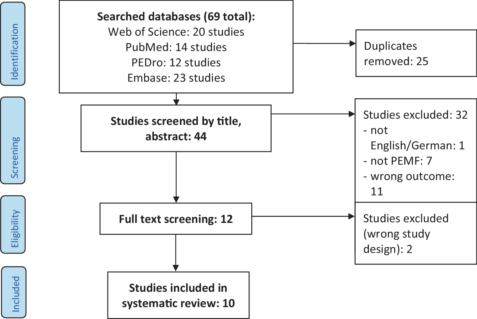 Our systematic review includes 10 systematic reviews that focus on the effect of PEMF on a variety of outcomes in patients with OA, as presented in Table 1. An overview of the literature search and selection process are presented in Fig. 1.