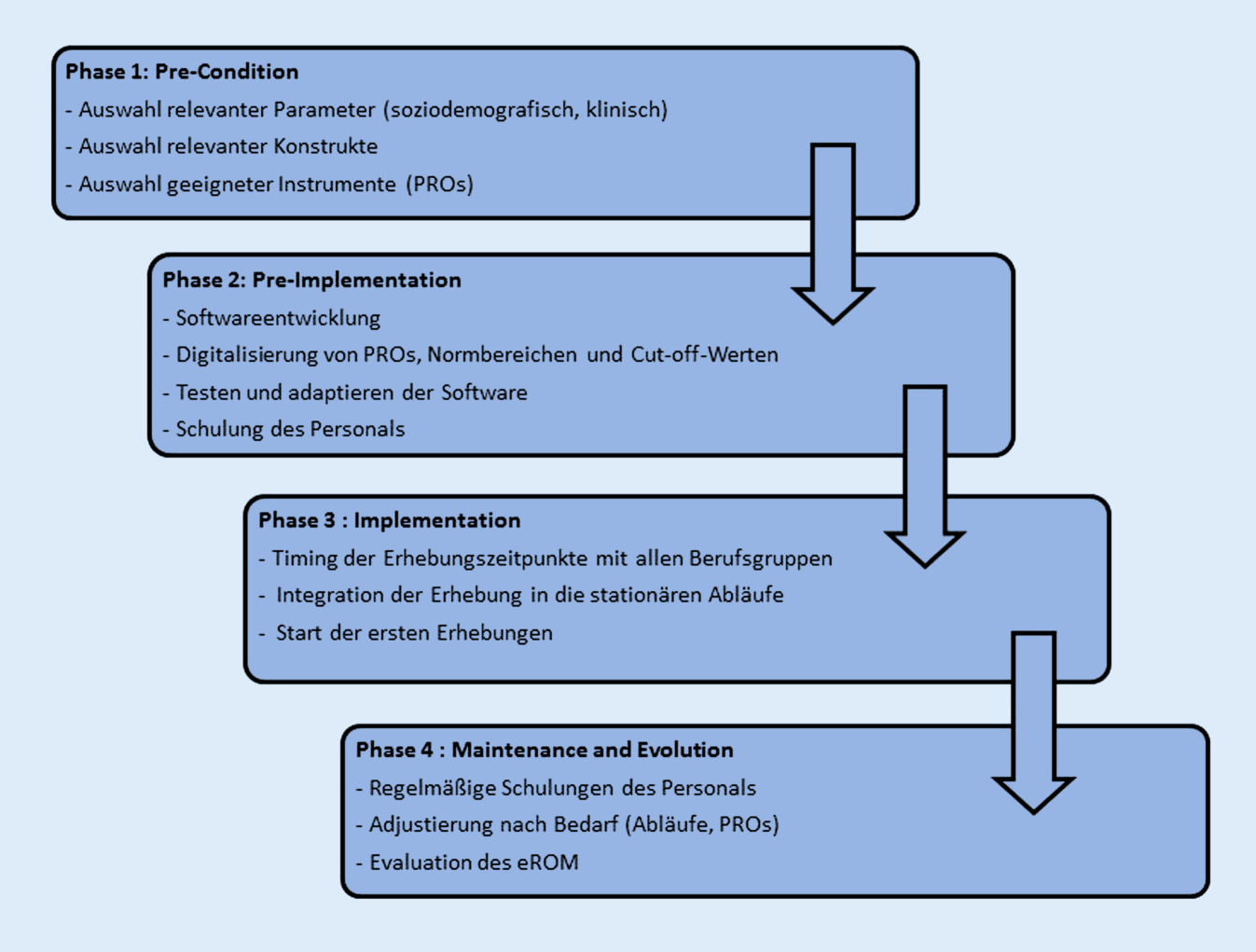 Ablaufplan der eROM-Implementierung. eROM elektronisches Routine-Outcome-Monitoring, PROs Selbstberichte von Patienten („patient-reported outcomes“)
