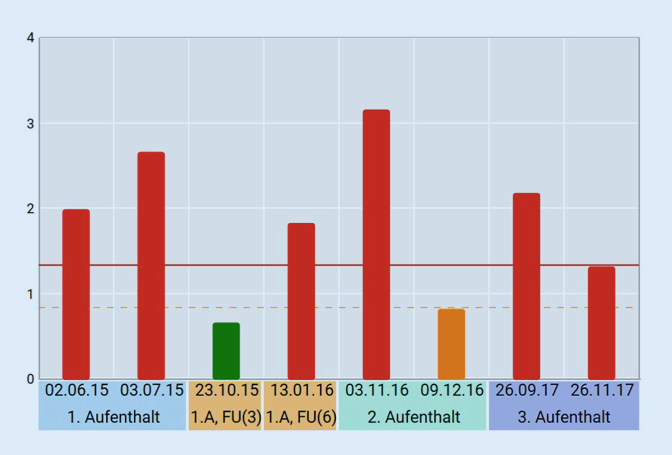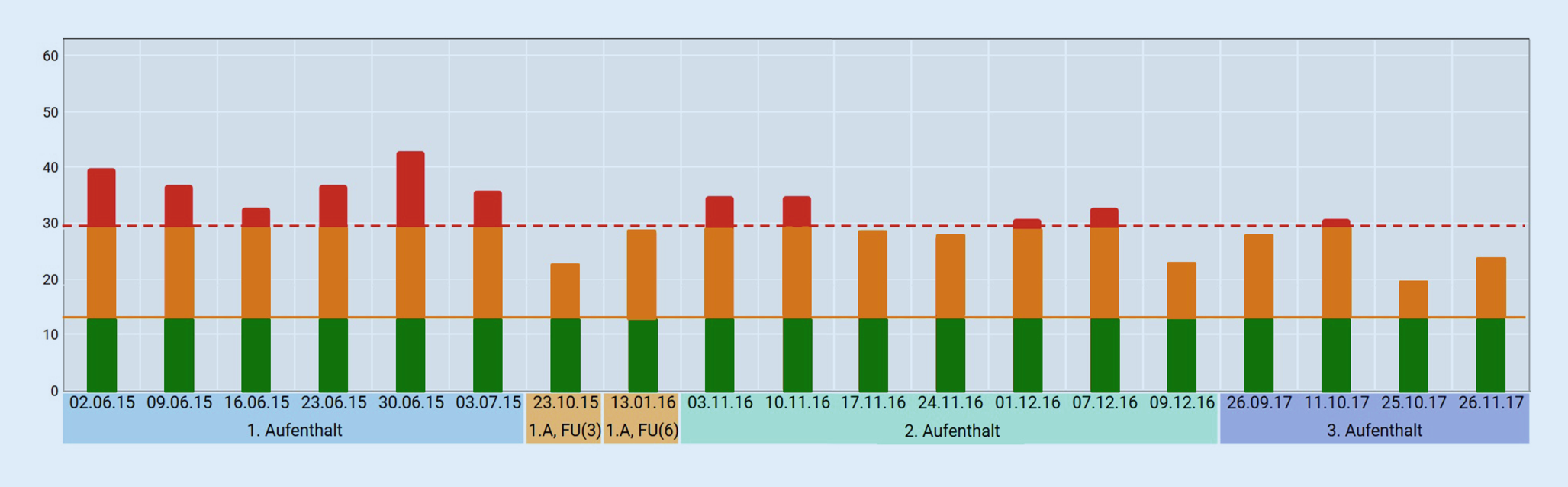 Die Daten des wöchentlich ausgefüllten Beck-Depressions-Inventars II zeigen während des ersten Aufenthalts (02.06.2015–03.07.2015, siehe Abb. 2) keine relevante Verbesserung der depressiven Symptomatik. Bei der ersten Follow-up-Erhebung hat sich die wahrgenommene depressive Symptomatik nahezu halbiert, was für eine deutliche Verbesserung spricht. Anfang 2016 zeigt sich zum zweiten Follow-up-Termin eine Verschlechterung, die bei der zweiten Aufnahme am 03.11.2016 weiter zunimmt. Es folgt ein 5‑wöchiger Aufenthalt, bei dem sich die Patientin bei Entlassung am 09.12.2016 gleich belastet beschreibt wie zum Zeitpunkt des ersten Follow-ups. Ähnlich der Verschlechterung vom ersten auf das zweite Follow-up, zeigt sich wieder einer Aggravation der depressiven Symptomatik, als sich die Patientin etwa 9 Monate später, am 26.09.2017, ein drittes Mal in stationäre Behandlung begibt. Vier Wochen später berichtet sie die bisher niedrigste Ausprägung ihrer depressiven Symptomatik, die zum Zeitpunkt der Entlassung am 26.11.2017 wieder leicht zunimmt (neuerlich vergleichbar mit der Ausprägung zum ersten Follow-up-Zeitpunkt).