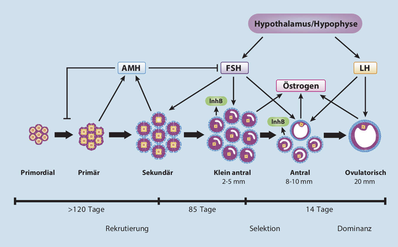 AMH reguliert den Follikelpool und das Follikelwachstum. Im Mausmodel konnte gezeigt werden, dass ein AMH-Mangel zu einer schnelleren Rekrutierung von Follikeln aus dem Primordialfollikelpool führt und entsprechend zu einer schnelleren Erschöpfung des Pools. Man spricht von einem „burn-out“ der Ovarreserve bei AMH-Mangel. AMH scheint also auch einen schützenden Effekt auf kleine heranwachsende Follikel zu haben [8].