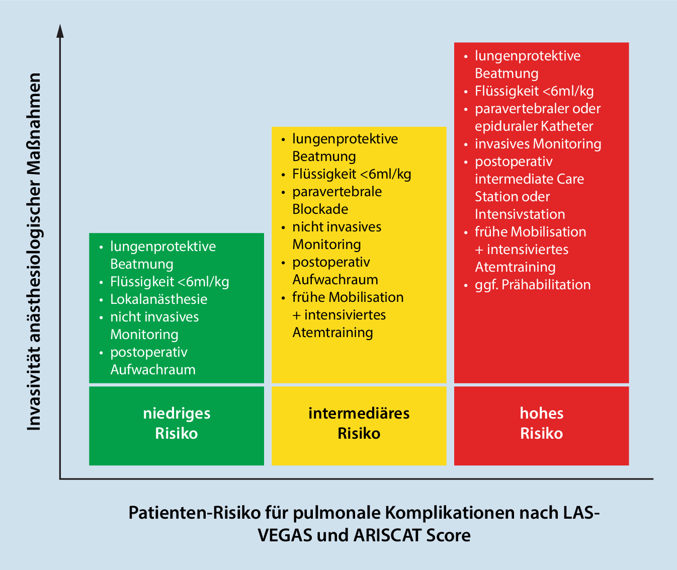 Es stellt sich also die Frage, wie invasiv und umfangreich anästhesiologische Maßnahmen sein müssen, um einerseits eine möglichst sichere und gute Versorgung zu gewährleisten und andererseits keine Übertherapie zu initiieren, die eine schnelle Erholung und Lebensqualität behindert. Diese Aspekte fehlen jedoch in der Leitlinie zu ERAS in der Thoraxchirurgie. Eine frühe Risikostratifizierung und Strategieentwicklung („early risk stratfication and strategy“, ERSAS) kann dazu beitragen, eine zielgerichtete Überwachung und Therapie durchzuführen, ohne die Patientensicherheit zu gefährden und ohne unnötig invasive Maßnahmen durchzuführen [15]. Ein für anästhesiologische Maßnahmen fokussiertes Beispiel liefert Abb. 1. Für postoperative pulmonale Komplikation lassen sich zum Beispiel anhand einer Score-basierten Risikostratifizierung entsprechende Therapiestrategien entwickeln, deren Umfang und Ausmaß mit dem Komplikationsrisiko korreliert. Das ERSAS-Prinzip lässt sich auf alle vier genannten Kernpunkte des ERAS-Konzepts übertragen.