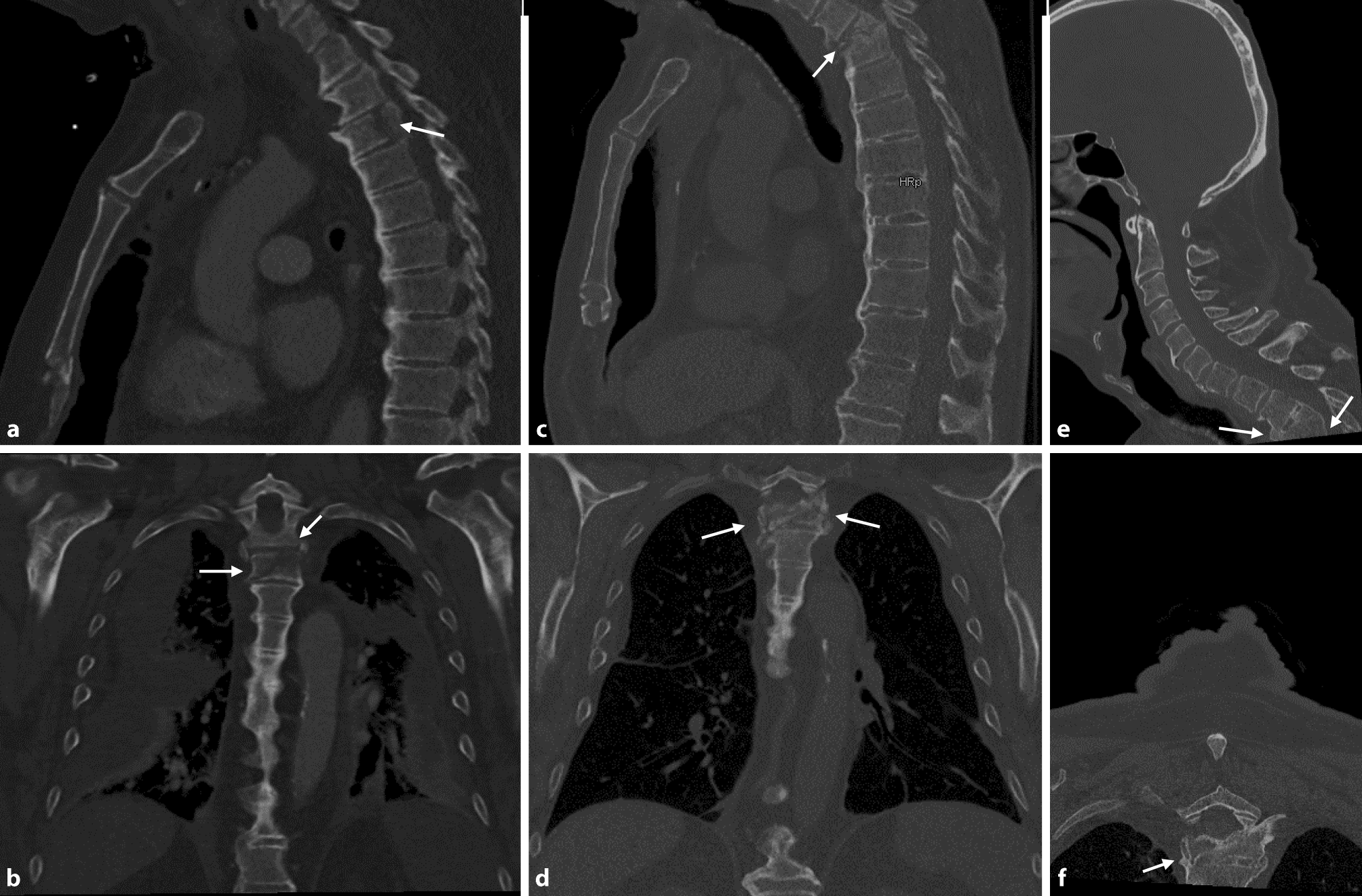 Follow-up images showing no apparent fracture healing at 18 days following trauma (thoracic CT scan; a sagittal plane, b frontal plane), progressive destruction of the T3 vertebra at 3 months (thoracic CT scan; c sagittal plane, d frontal plane), and finally intersegmental fusion after 41 months (cranial CT scan down to cervicothoracic junction; e sagittal plane, f axial plane). Arrows mark T3 vertebra