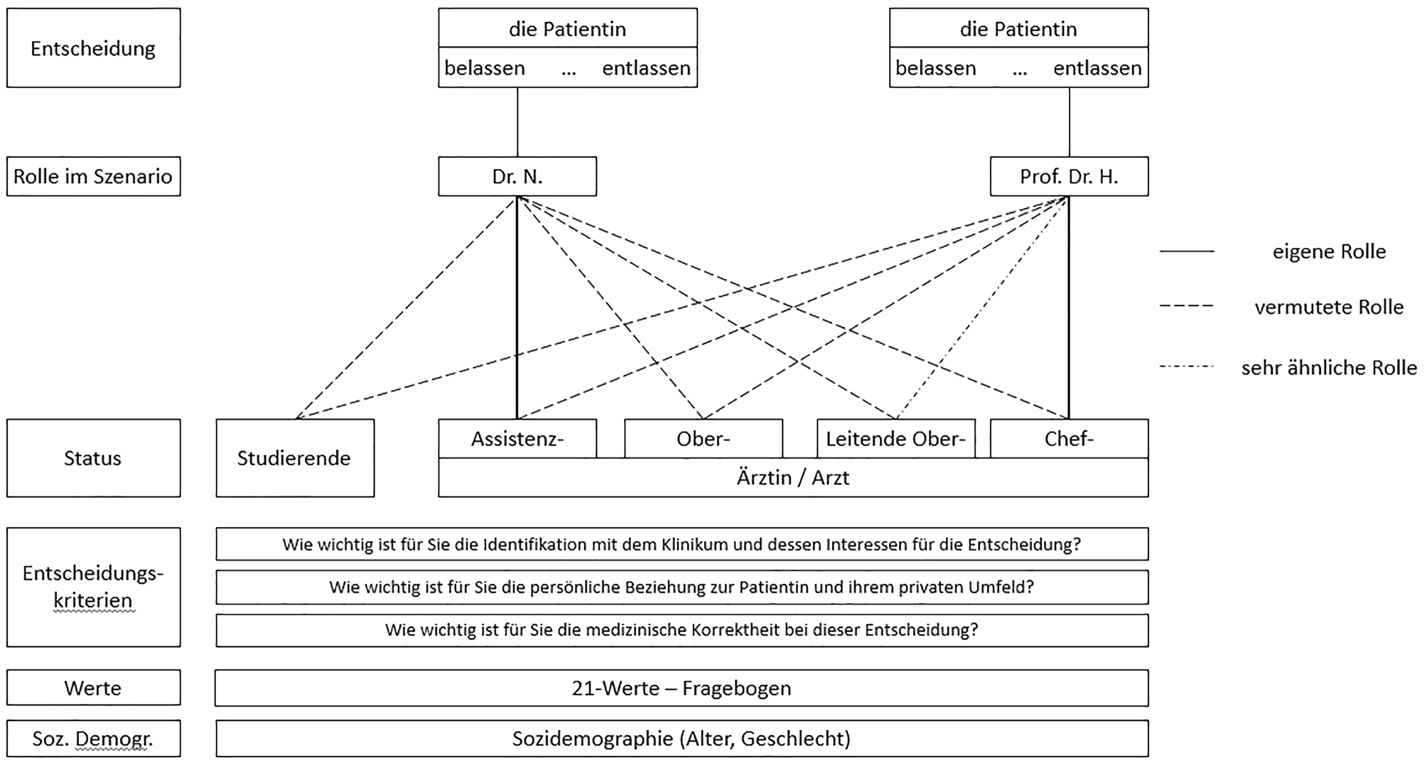 Die Entscheidungen von allen anderen Teilnehmenden geben Vermutungen über die Rolle eines Assistenzarztes oder Chefarztes wieder. Misstrauen würde sich in einer stärkeren Befürwortung der Entlassung an Stelle des Chefarztes Prof. H. zeigen.
