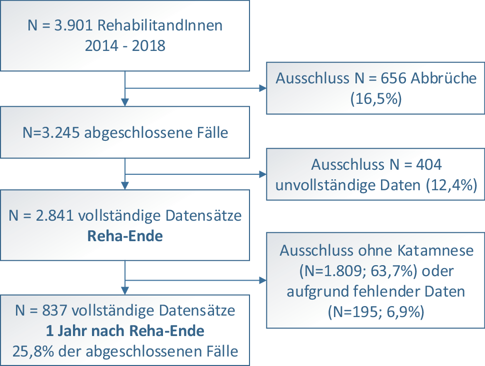 Im Zeitraum 2014 bis 2018 haben 3901 PatientInnen eine ambulante psychiatrische Rehabilitation absolviert, in 16,8 % der Fälle wurde die Behandlung abgebrochen. Die Teilnahme an der schriftlichen Befragung ist grundsätzlich freiwillig, aber beinahe 90 % der PatientInnen bearbeiteten die psychometrischen Verfahren. Voraussetzung für den Einschluss in diese Studie war das Vorliegen aller drei Messzeitpunkte (Beginn und Ende sowie ein Jahr nach Ende der Rehabilitation). Bei der Befragung ein Jahr nach Reha-Ende haben 1032 PatientInnen teilgenommen (31,8 % der abgeschlossenen Fälle), allerdings konnten aufgrund fehlender Werte nur 837 Fälle in die Analyse einbezogen werden, das sind 25,8 % der abgeschlossenen Fälle (Abb. 1).