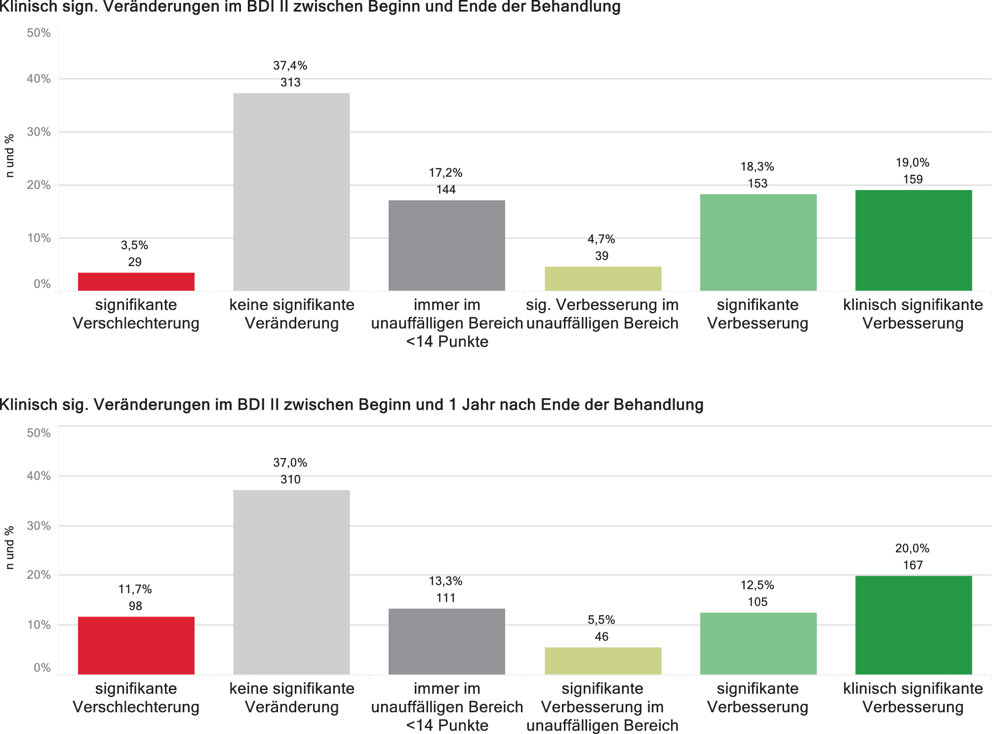 Das Konzept der klinischen Signifikanz erfordert die Erfüllung von zwei Bedingungen – eine reliable Verbesserung um ein Mindestmaß und den Wechsel vom dysfunktionalen in den funktionalen Bereich. Aus der Kombination dieser beiden Anforderungen ergeben sich sechs verschiedene Ergebniskategorien (Tab. 1). Zwei dieser Kategorien betreffen PatientInnen, die immer im unauffälligen Bereich liegen oder innerhalb dieses Bereichs signifikante Veränderungen zeigen. Diese beiden Gruppen machen am Ende der Behandlung immerhin 21,9 % und ein Jahr später 18,8 % der Stichprobe aus. Gut 1/3 der PatientInnen zeigt weder am Ende der Behandlung noch ein Jahr später eine signifikante Veränderung der depressiven Symptomatik (Abb. 2).