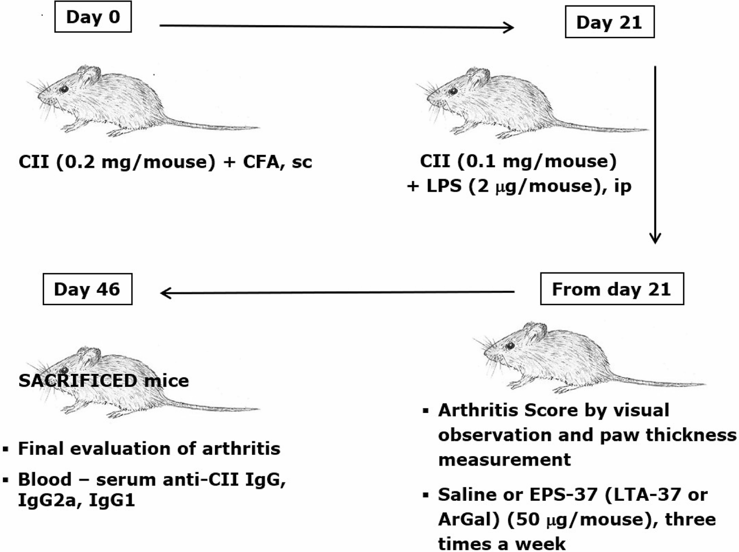 CIA induction and examination protocol: mice were immunized with CII in the presence of CFA (day 0, first immunization) and with CII in the presence of LPS (day 21, second immunization, ip: intraperitoneal). EPS-37 (or LTA-37, or ArGal) were given to mice systemically—intravenously (iv) or subcutaneously (sc) three times a week starting on the day of second immunization (day 21) till the end of the experiment. Development of arthritis was examined by visual observation, paw thickness measurement and, finally, the level of anti-CII antibodies was measured in the mouse serum