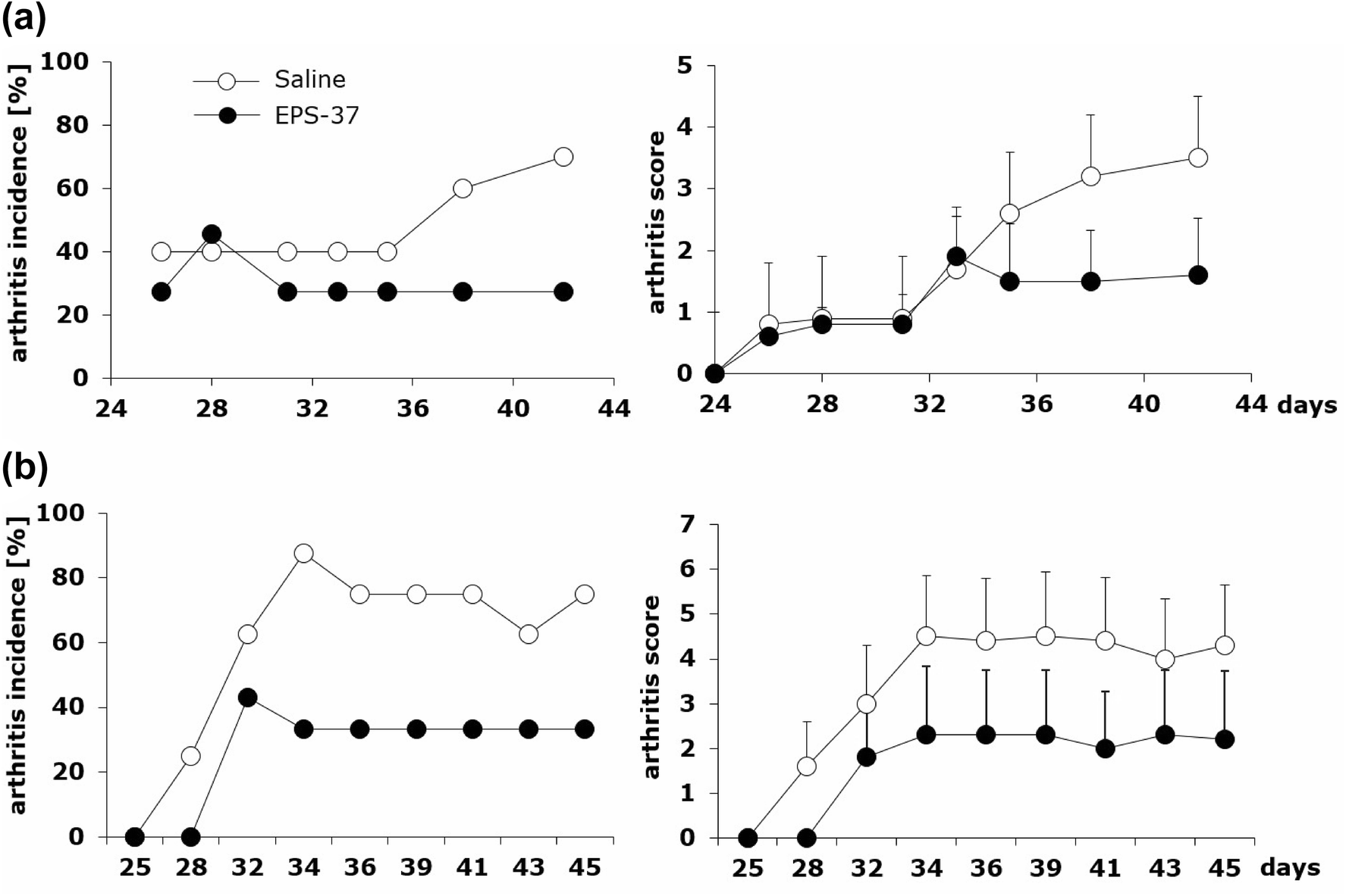 Differential effects of intravenous and subcutaneous administration of pure EPS-37 on the development of CIA. Mice immunized with CII in the presence of CFA (day 0, first immunization, sc) and with CII in the presence of LPS (day 21, second immunization, ip) were given saline (open circles) or EPS-37 (black circles) systemically, intravenously (a) or subcutaneously (b) three times a week starting on the day of second immunization (day 21) till the end of the experiment. Results are expressed as arthritis incidence—the percentage of mice with signs of arthritis and arthritis score expressed in points ± SEM. Data represent one out of three similar experiments