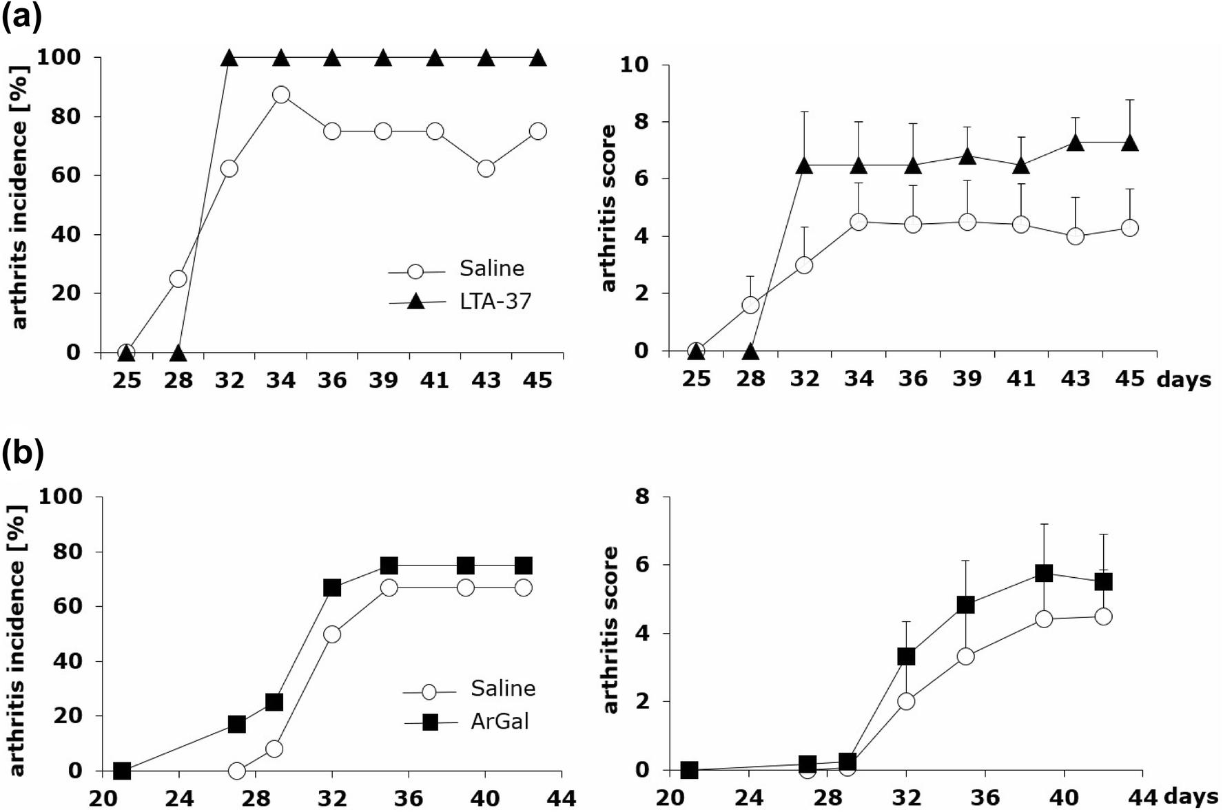 Comparison of LTA-37 and ArGal capacity to affect the development of CIA. Mice immunized with CII in the presence of CFA (day 0, first immunization, sc) and with CII in the presence of LPS (day 21, second immunization, ip) were given saline (open circles) or LTA-37 (a black triangles) or ArGal (b black squares) three times a week starting on the day of second immunization (day 21) till the end of the experiment. Results are expressed as arthritis incidence—the percentage of mice with signs of arthritis and arthritis score expressed in points ± SEM. Data represent one out of three similar experiments