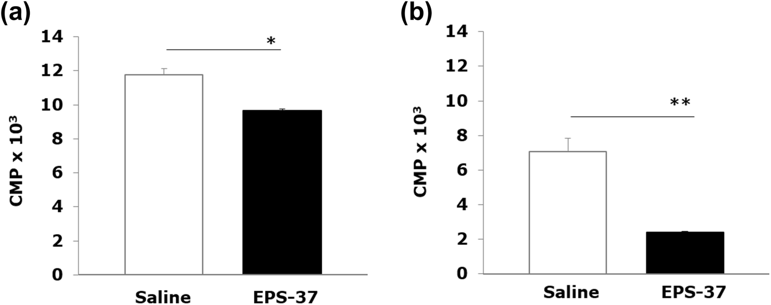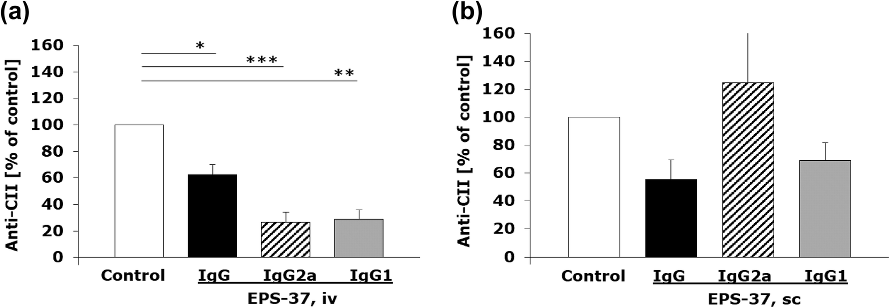 EPS-37 given intravenously ameliorated CIA (Fig. 2a) and significantly suppressed the production of CII-specific IgG (and IgG2a, IgG1) detected in mouse serum (Fig. 4a), as compared to control CII-immunized mice that were injected with saline. On the other hand, although EPS-37 administered subcutaneously showed suppressing effect on the development of CIA (Fig. 2b), the serum level of anti-CII IgG and IgG1 antibodies was not significantly reduced. The level of anti-CII IgG2a antibodies measured in serum was even increased, although without statistical significance (Fig. 4b).