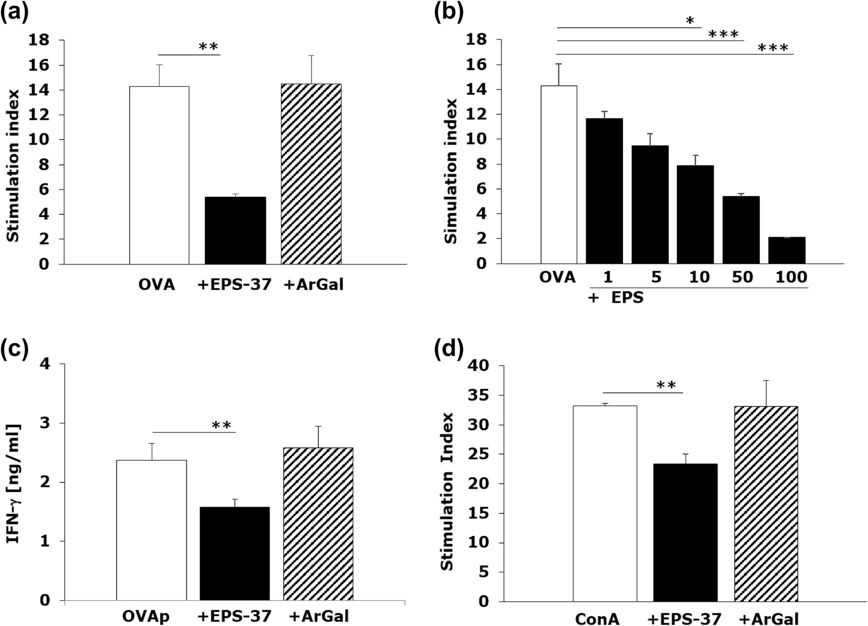 EPS-37 inhibits mitogen induced and antigen specific T-cell proliferation in vitro. Spleen cells from OT II transgenic (a–c) or C57BL6 mice (d) were stimulated (white bars) in vitro (5 × 105/well, in 0.2 ml) with 100 μg/ml OVA (a, b) or 1 μg/ml OVA 323–339 peptide (OVAp, c), or 1 μg/ml concanavalin A (ConA, d). EPS-37 (black bars) (30 μg/ml; except b 1–100 μg/ml) or ArGal (hashed bars) (30 μg/ml) were added to the culture. 3H-thymidine was introduced into the culture for the last 18 h. The proliferation of cells is shown as stimulation index (CPM of stimulated cell/CPM of unstimulated cells) (a, b, d). IFN-γ (c) content measured in cell culture supernatant is shown in ng/ml. Results of selected experiments, expressed as a mean of triplicates of the culture wells ± SEM are shown. *P < 0.05, **P < 0.01, ***P < 0.001