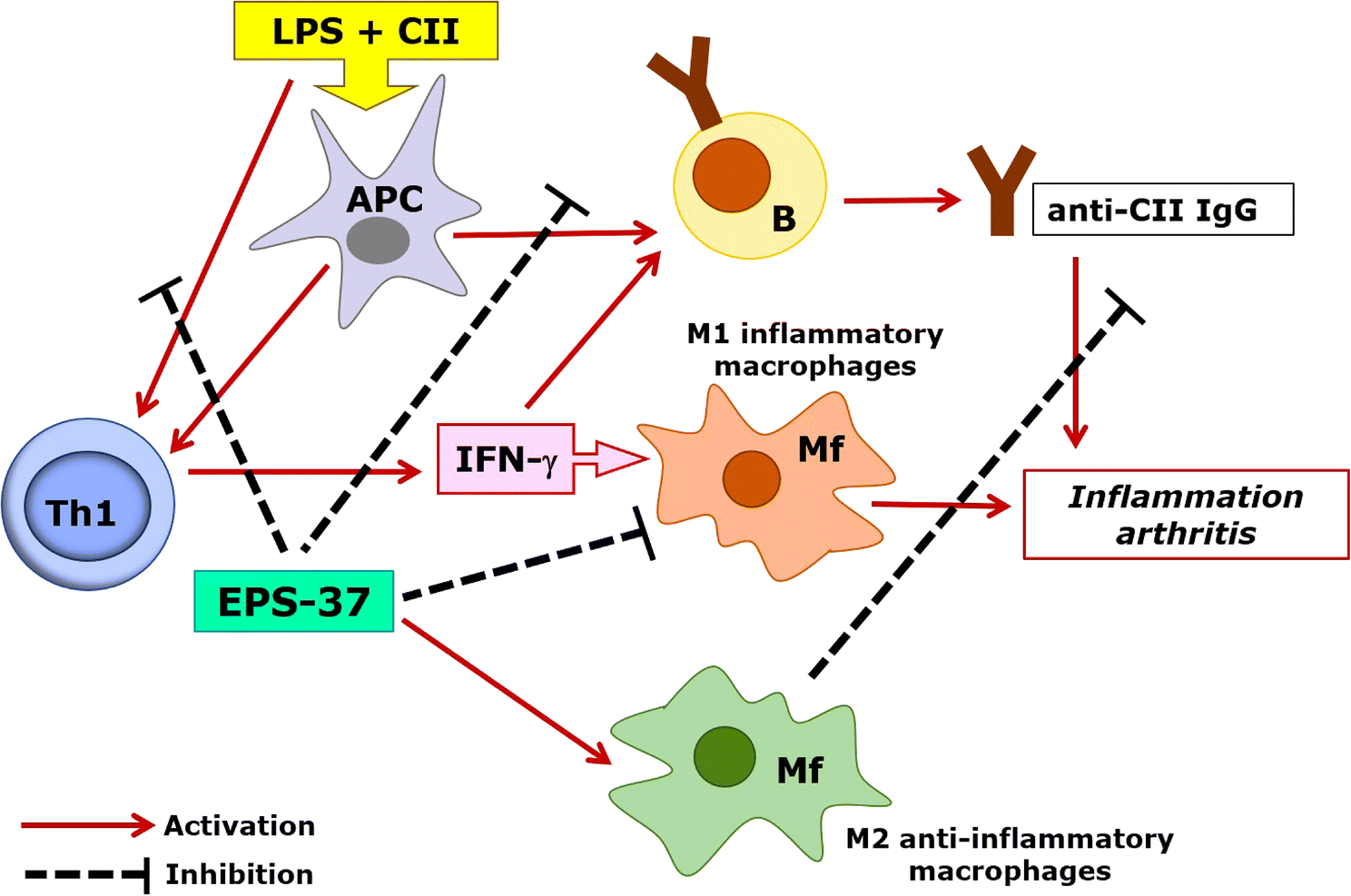 Hypothetical model of EPS-37 modulation of immune response in the course of CIA. Purified EPS-37 inhibits T-cell proliferation and a production of IFN-γ. Such action favors M2 macrophage polarization (an anti-inflammatory effect) and facilitates suppression of arthritogenic CII-specific IgG (T cell-dependent humoral response). Suppression = hash mark, Activation = solid line