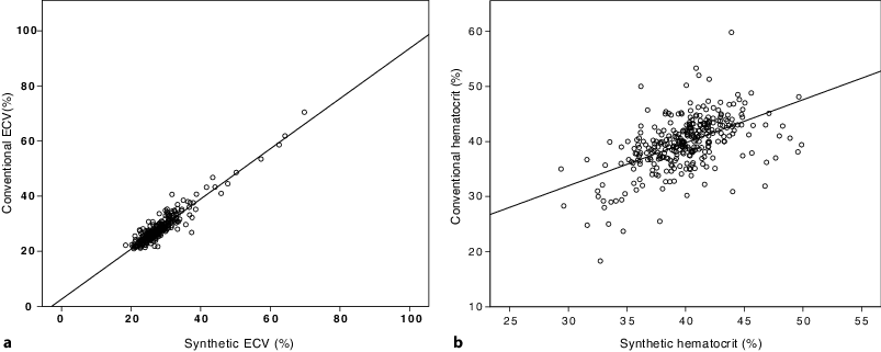 Recently, Treibel et al. demonstrated a linear relationship of hematocrit and blood relaxivity (R1 = 1/blood pool T1 time), which was used to develop a synthetic hematocrit and ECV [25]. The authors postulated that synthetic ECV allows reliable noninvasive quantification of myocardial ECV without blood sampling. So far, that is the only working group that has evaluated the accurateness of synthetic ECV. The aim of the present study was to develop and test a formula for the calculation of synthetic ECV at our center.
