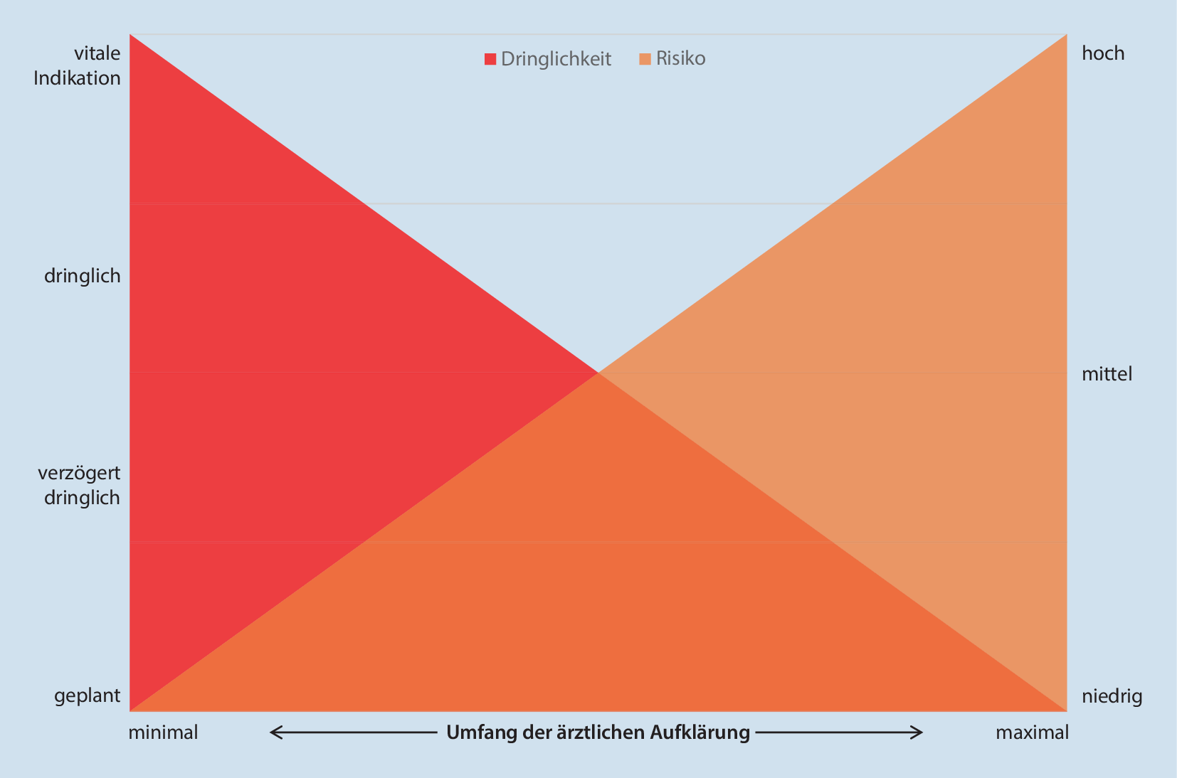 In Abb. 1 soll der Anspruch an den Umfang der ärztlichen Aufklärung in Abhängigkeit von Risiko und Dringlichkeit eines Eingriffs zur Verdeutlichung grafisch dargestellt werden.