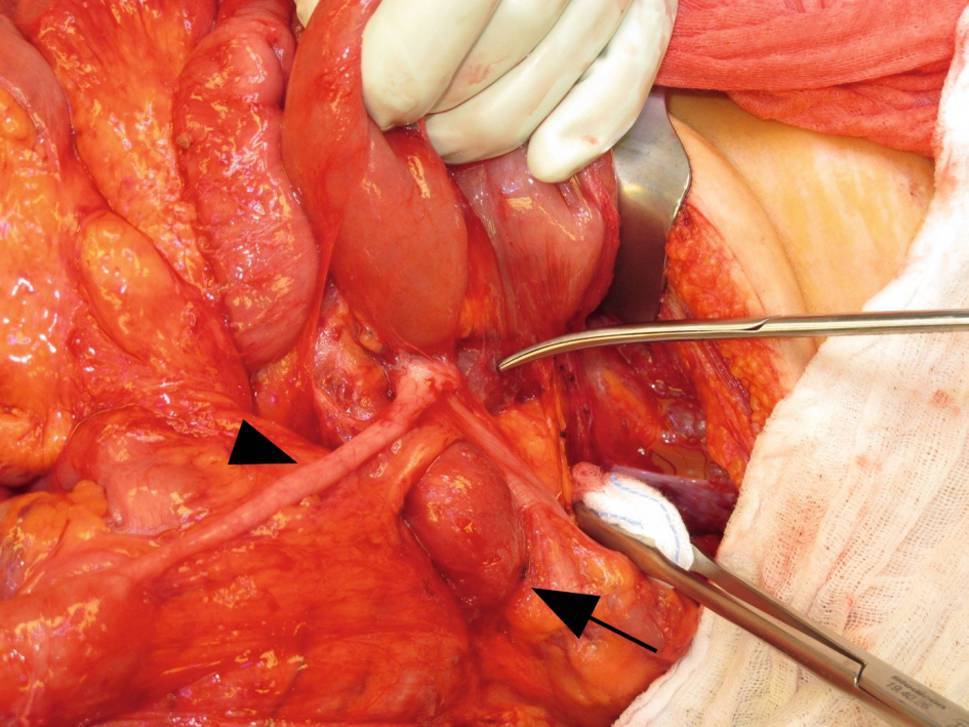 Intraoperative situs: Fusion from the appendix (arrowhead) and spleen (upper instrument) with protrusion of the small intestine (arrow)