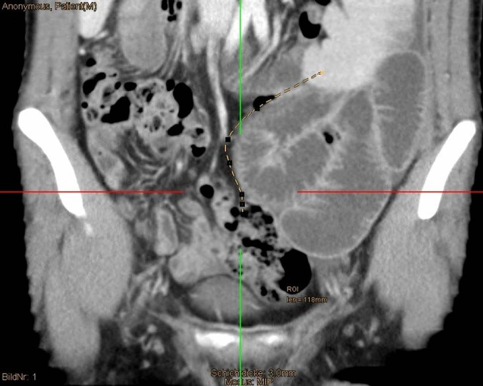Maximum intensity projection (MIP) from a venous CT scan with the appendix’s planning path (dashed yellow line) from the medial caecum to the distal spleen. Dilated small intestine bowel loops can be detected in the left lower abdomen