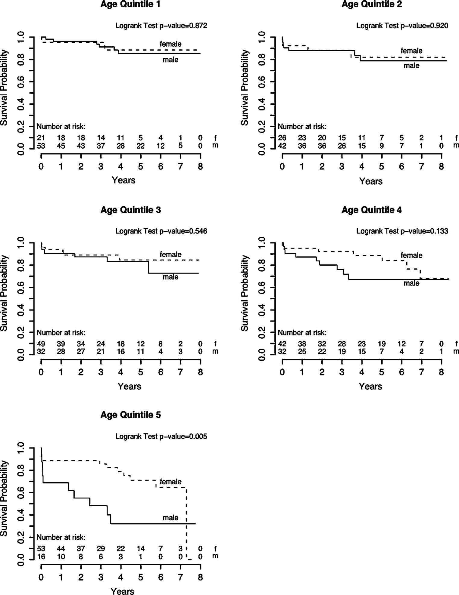 Outcomes following surgical aortic valve replacement. Survival rates after surgical aortic valve replacement are comparable between sexes across age groups apart from the fifth age quintile (78 years or older), where women showed superior survival as compared to men. (Figure printed with permission from Fuchs et al. [7])