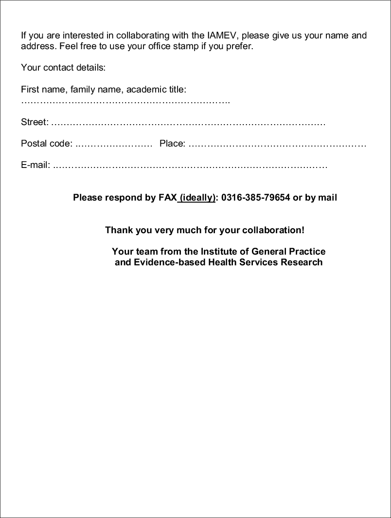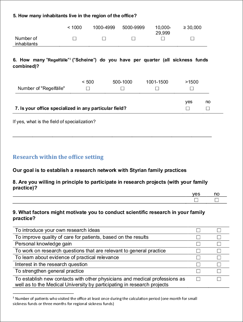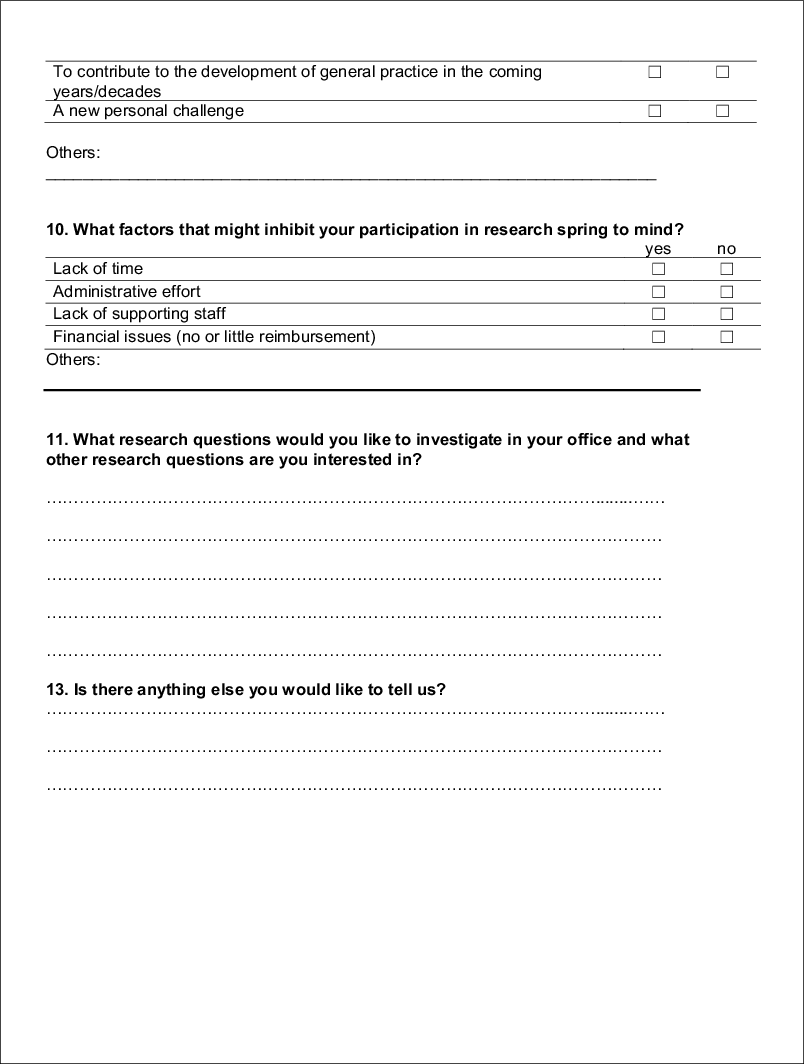The first part asked for sociodemographic data on the physician and the medical practice. The second part consisted of 17 yes/no questions to determine the GP’s interest in research and specifically in taking part in research projects. It also asked about factors motivating and inhibiting participation in scientific research projects. In addition, GPs could add their own research ideas and other comments in the free-text boxes provided. By giving their addresses in the third part of the questionnaire, GPs indicated their willingness to be contacted for future collaboration.