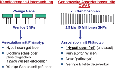 Prinzip von Kandidatengen-Untersuchungen und genomweiten Assoziationsstudien (GWAS)