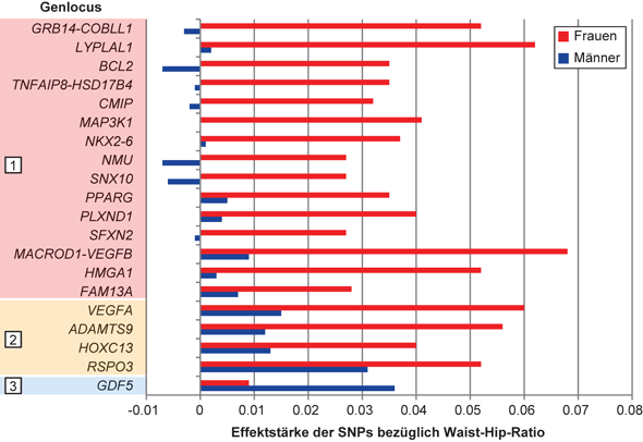 Geschlechtsspezifische Unterschiede kennen wir hauptsächlich nur für den Phänotyp Waist-Hip-Ratio. Ca. zwei Fünftel für diesen Phänotyp bekannten Genvarianten weist bei Frauen einen deutlich stärkeren Effekt wie bei Männern auf.