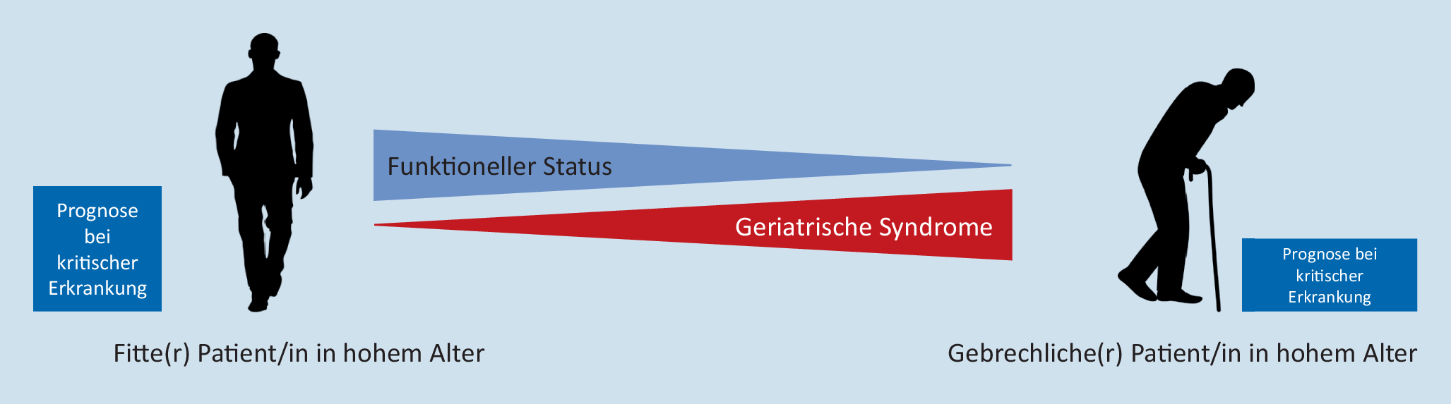 Frailty ist als klinischer Zustand definiert, welcher die Anfälligkeit von älteren Menschen für Stressoren erhöht [10]. Bis zu 50 % der Patient*innen im Alter von 80 oder mehr Jahren gelten als frail. In der Gesamtbevölkerung geht ein hohes Alter mit einer Zunahme der Frailty einher, das hohe Alter ist aber nicht allein ausschlaggebend für eine Zunahme der Frailty. Viele verschiedene Faktoren wie genetische Prädisposition oder Umwelteinflüsse spielen eine wichtige Rolle [7]. Gebrechliche Patient*innen haben bei einer intensivmedizinischen Behandlung ein deutlich erhöhtes Morbiditäts- und Mortalitätsrisiko, weiterhin kommt es nach einer intensivmedizinischen Behandlung signifikant häufiger zu funktionellen Beeinträchtigungen, oft mit Notwendigkeit der Aufnahme ins Pflegeheim [8].