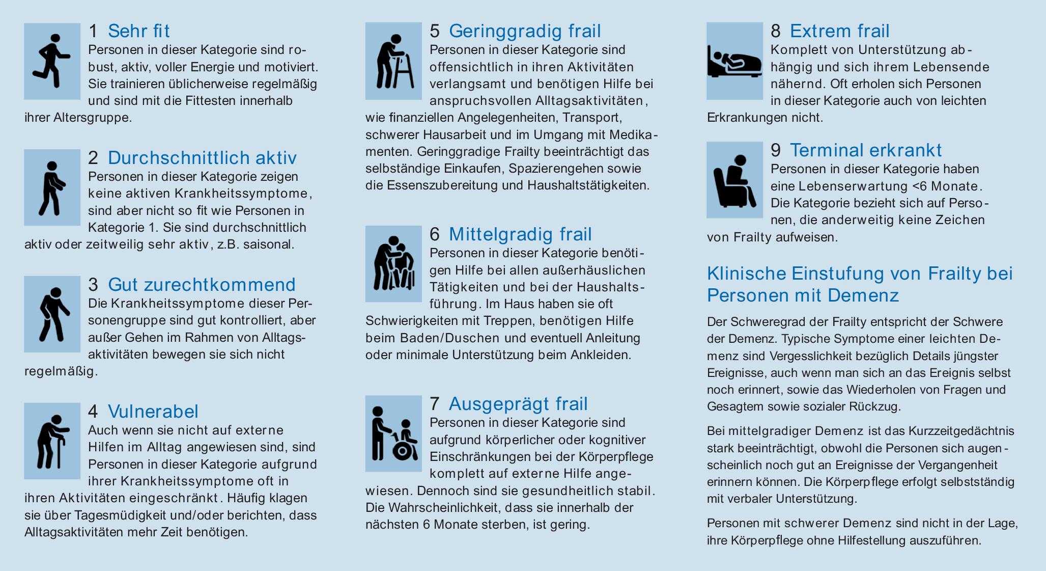 Die Einschätzung der Frailty ist für die intensivmedizinische Therapiestrategie von besonderer Bedeutung. Eine geeignete Methode hierfür auf der Intensivstation ist die Clinical Frailty Scale (CFS) bzw. klinische Frailty-Skala [12]. Die CFS ist in einer deutschen Übersetzung und den entsprechenden Piktogrammen auf der Homepage der deutschen Gesellschaft für Geriatrie (DGG) e. V. unter https://www.dggeriatrie.de/images/Bilder/PosterDownload/200331_DGG_Plakat_A2_Clinical_Frailty_Scale_CFS.pdf verfügbar und in Abb. 2 dargestellt [11]. Wichtig bei der Erhebung der Clinical Frailty Scale ist, dass von den Patient*innen, Angehörigen, Pflegenden, etc. erfragt wird, welchen Zustand die betreffende Person zwei Wochen vor der jeweiligen akuten Situation hatte. Auf keinen Fall darf sich also die Einschätzung auf den aktuellen Ist-Zustand, in der sich die betreffende Person befindet, beziehen.