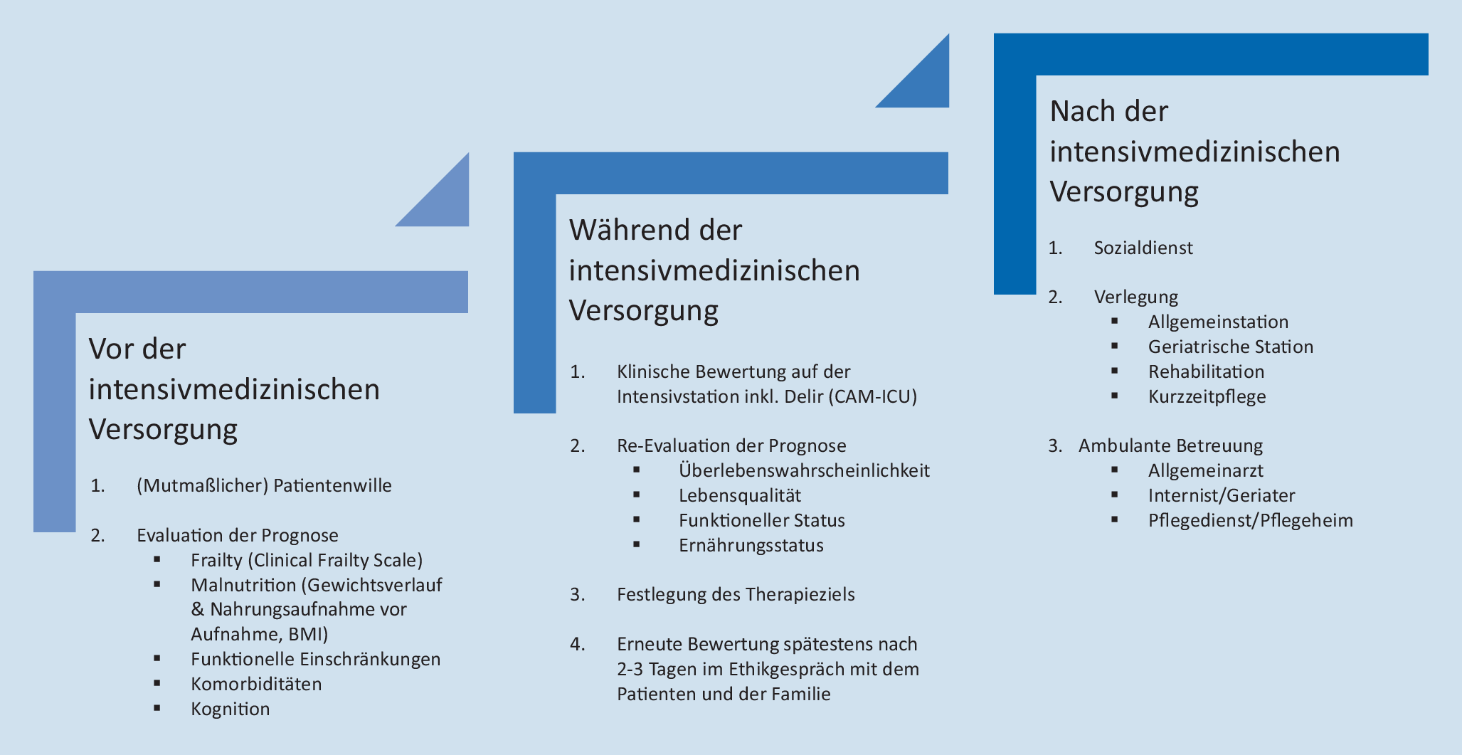 Während der intensivmedizinischen Behandlung von geriatrischen Patient*innen ist eine ständige klinische Bewertung und Re-Evaluation der Prognose mit Festlegung der Therapieziele notwendig. Spätestens nach zwei bis drei Tagen der intensivmedizinischen Versorgung sollte eine erneute Bewertung der Situation erfolgen. Zukünftig kann die Eingruppierung der Patient*innen in reproduzierbare Phänotypen, die auf akutmedizinischen und geriatrischen Merkmalen beruhen, zur Prognoseeinschätzung und spezifischen intensivmedizinischen Therapie hilfreich sein [35].