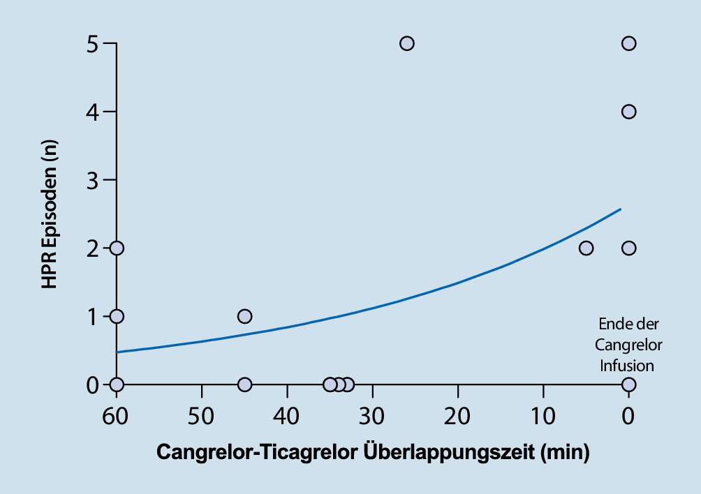 Beziehung zwischen der Überlappungszeit Cangrelor und Ticagrelor (x-Achse) und der Anzahl (n) an „high platelet reactivity“(HPR)-Episoden nach Absetzen von Cangrelor (y-Achse). Die HPR-Episoden nahmen mit abnehmender Ticagrelor/Cangrelor-Überlappungszeit signifikant zu. Angepasst von [12]. NB: Es wurde ausschließlich die Cangrelor-Ticagrelor-Transition untersucht. Bei Clopidogrel würde aus pharmakodynamischen Gründen eine „zu frühe“ Transition ebenso mit dem Risiko einer insuffizienten Thrombozytenaggregationshemmung (TAH) einhergehen. Darauf wird auch in der Cangrelor-Fachinformation hingewiesen