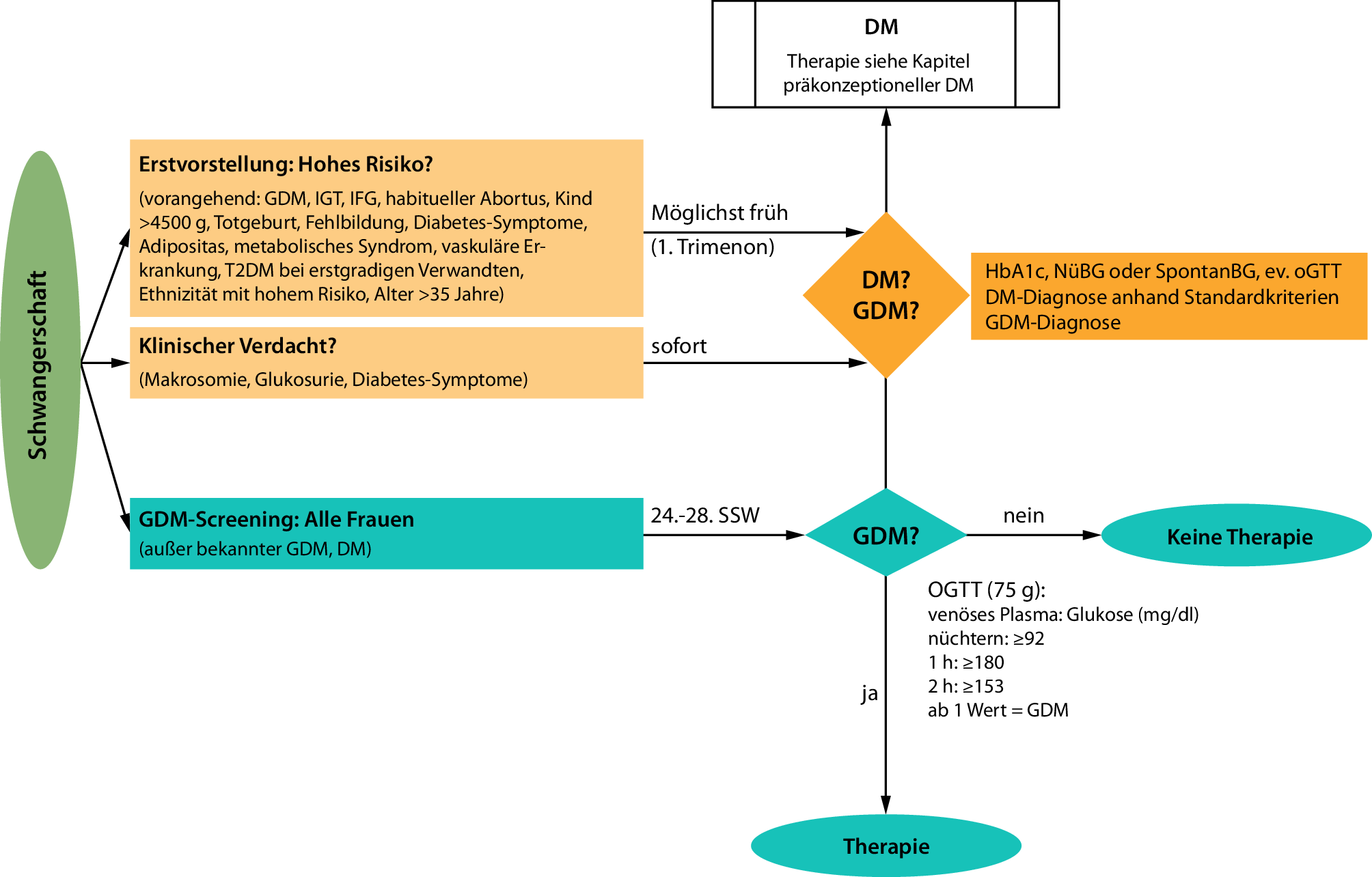 Bei Erstvorstellung beim Frauenarzt wird die Schwangere bezüglich ihres Risikos für GDM oder Diabetes mellitus eingestuft. Bei Vorliegen eines höheren Risikos soll die Frau möglichst früh hinsichtlich einer Glukosestoffwechselstörung untersucht werden: Dies kann durch eine Nüchternglukosemessung, eine Spontanglukosemessung, eine HbA1c-Bestimmung und/oder Durchführung eines OGTT erfolgen.