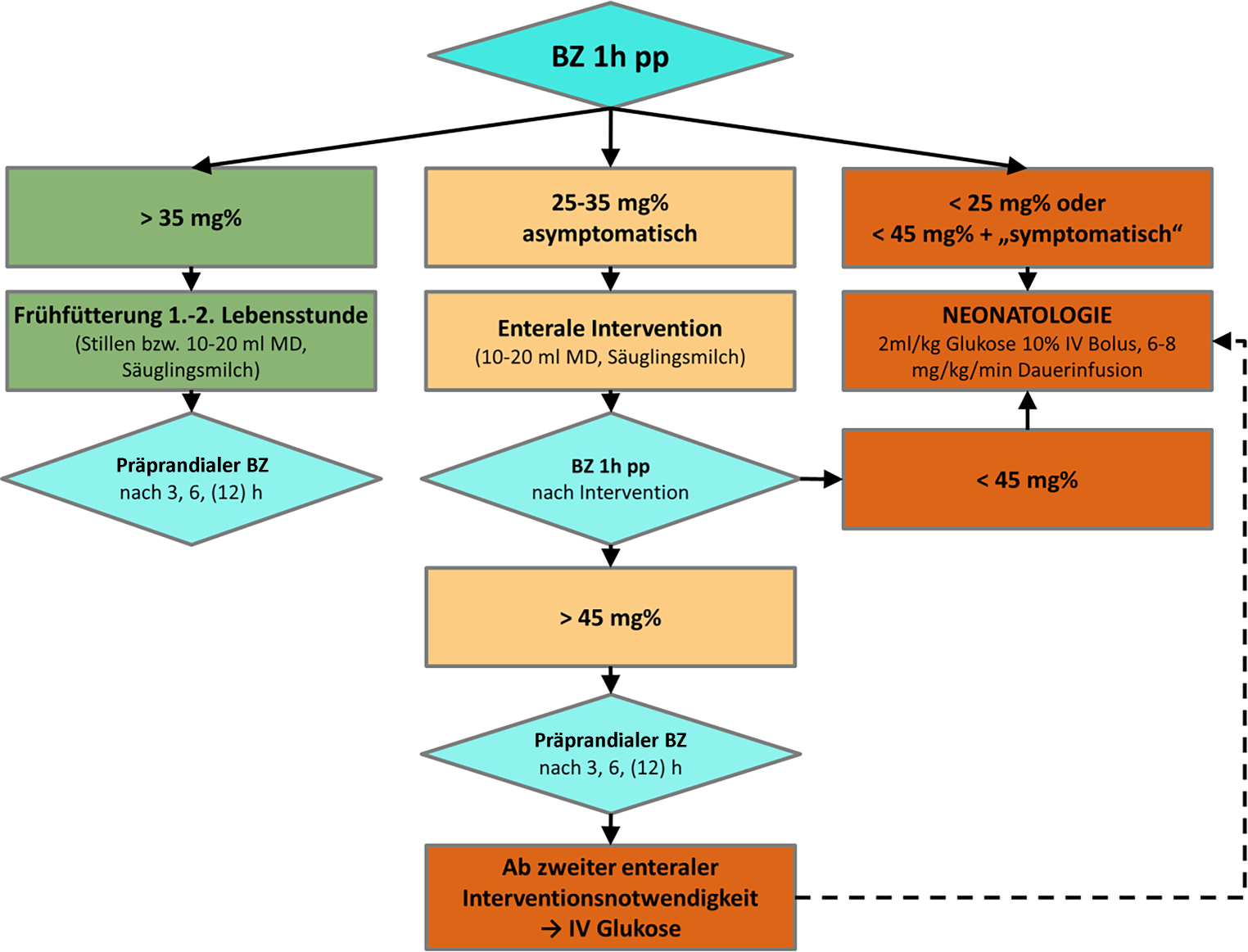 Weitere Messungen: Zumindest 2‑mal vor den nächsten beiden Mahlzeiten (ca. nach 3 und 6 h, evtl. auch nach 12 h z. B. bei mütterlichem Diabetes, grenzwertigen Messungen). Ende der Messungen: Es sollen zumindest 2 normale präprandiale Glukosewerte hintereinander dokumentiert sein, um die Messungen beenden zu können.