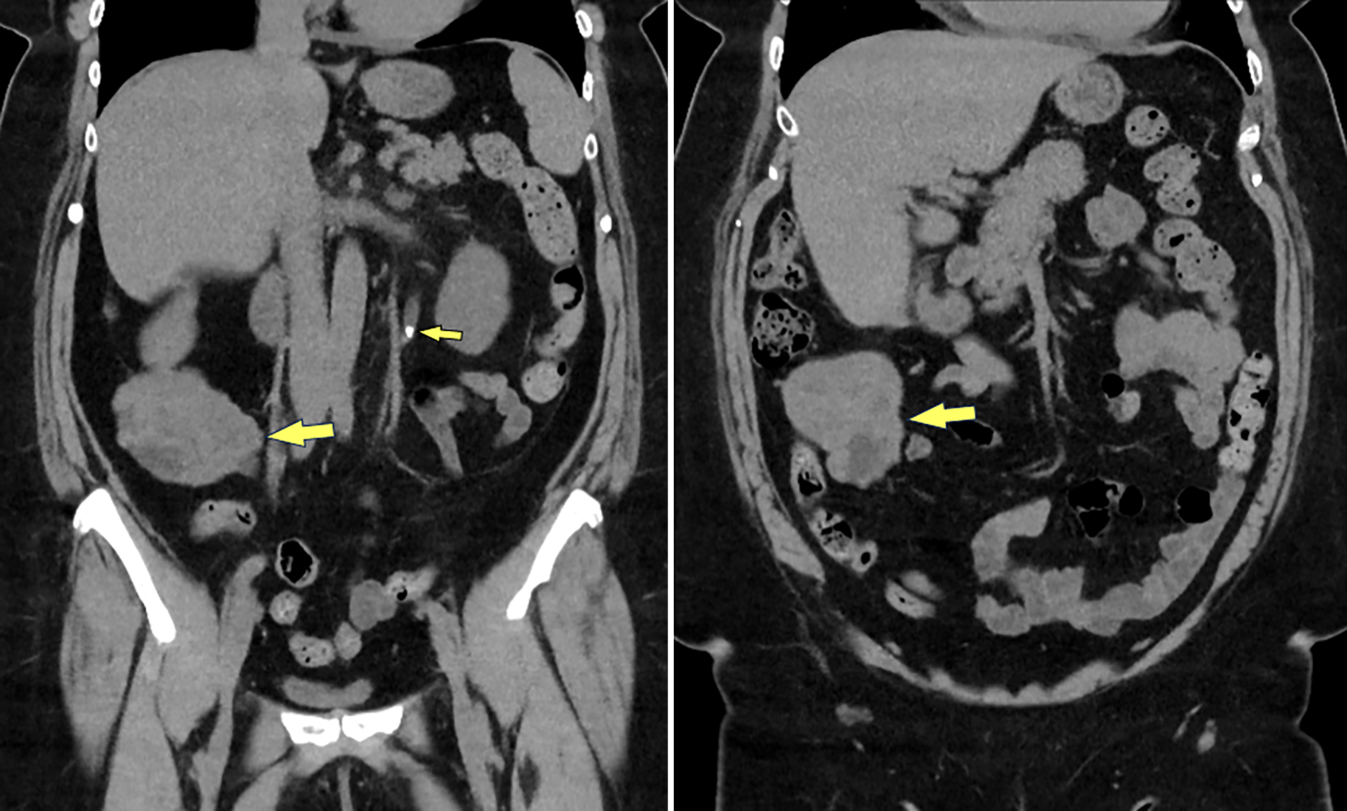 Die Nativ-MDCT von Niere und ableitenden Harnwegen zeigt das proximale Ureterkonkrement links (kleiner Pfeil) und den Zufallsbefund einer Raumforderung im rechten Mittelbauch (große Pfeile), mit Nahebeziehung zu Darmschlingen