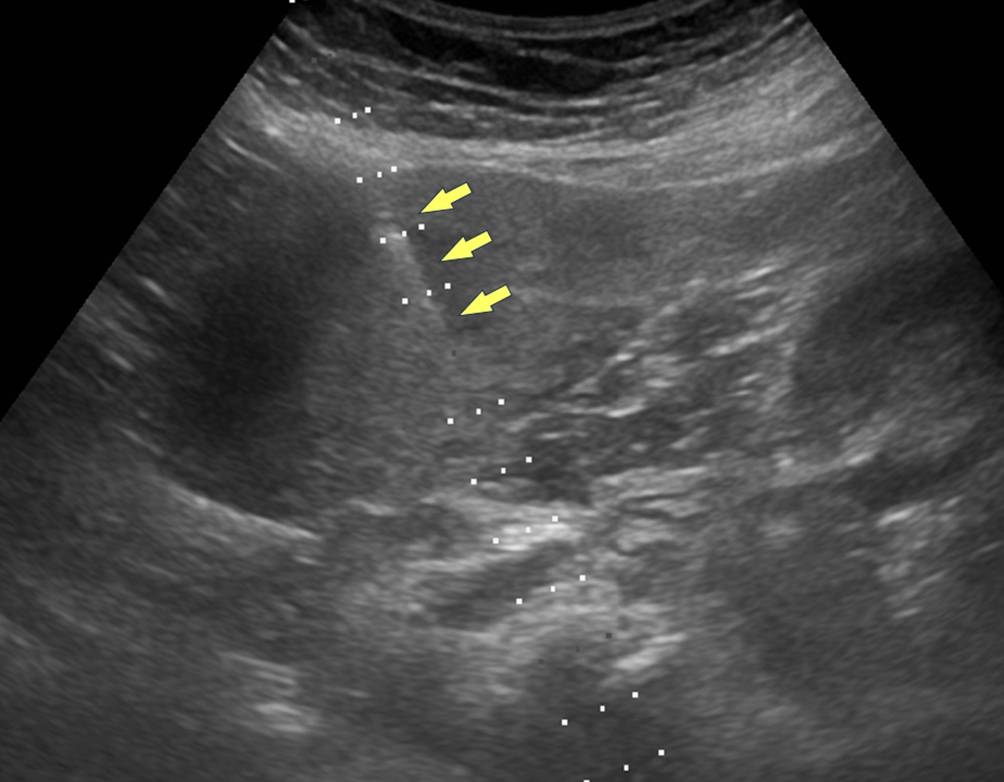 Eine 59-jährige Patientin mit linksseitigen Nierenkoliken wurde auswärts zu einer Nativ-CT der nierenableitenden Harnwege zugewiesen, welche ein linksseitiges Ureterkonkrement und eine Hydronephrose Grad II zeigte (Abb. 1). Zusätzlich fand sich eine Raumforderung im rechten Mittelbauch, welche in dieser Nativ-CT als Dünndarm-GIST befundet wurde. Eine daraufhin durchgeführte Ultraschall-gezielte Stanzbiopsie (Abb. 2), welche nur wenig Material ergab, wurde pathohistologisch als „spindelzelliger Tumor“ befundet. Eine chirurgische Resektion wurde empfohlen und die Patientin suchte dazu unsere Institution auf. Zur besseren Abklärung der Raumforderung führten wir eine mehrphasige Kontrastmittel-verstärkte Multidetektor-CT (MDCT) des Abdomens durch. Diese bestätigte den Befund eines vom Dünndarm ausgehenden Tumors nicht. Es konnte gezeigt werden, dass es sich um eine gestielte, vom kaudalen Rand des rechten Leberlappens abgehende Raumforderung mit arterieller und venöser Gefäßversorgung aus der Leber handelte (Abb. 3, Video 1). Auffällig war ein inhomogenes Kontrastmittel-Enhancement, wobei die periphere, sehr intensive Kontrastmittelaufnahme an ein Hämangiom erinnerte. Zur näheren Eingrenzung der Ätiologie wurde noch eine Gadolinium-verstärkte Magnetresonanztomographie (MRT) durchgeführt, welche regressive Veränderungen der Raumforderung darstellte, mit Anteilen Hämangiom-typischen Enhancements (Abb. 4).