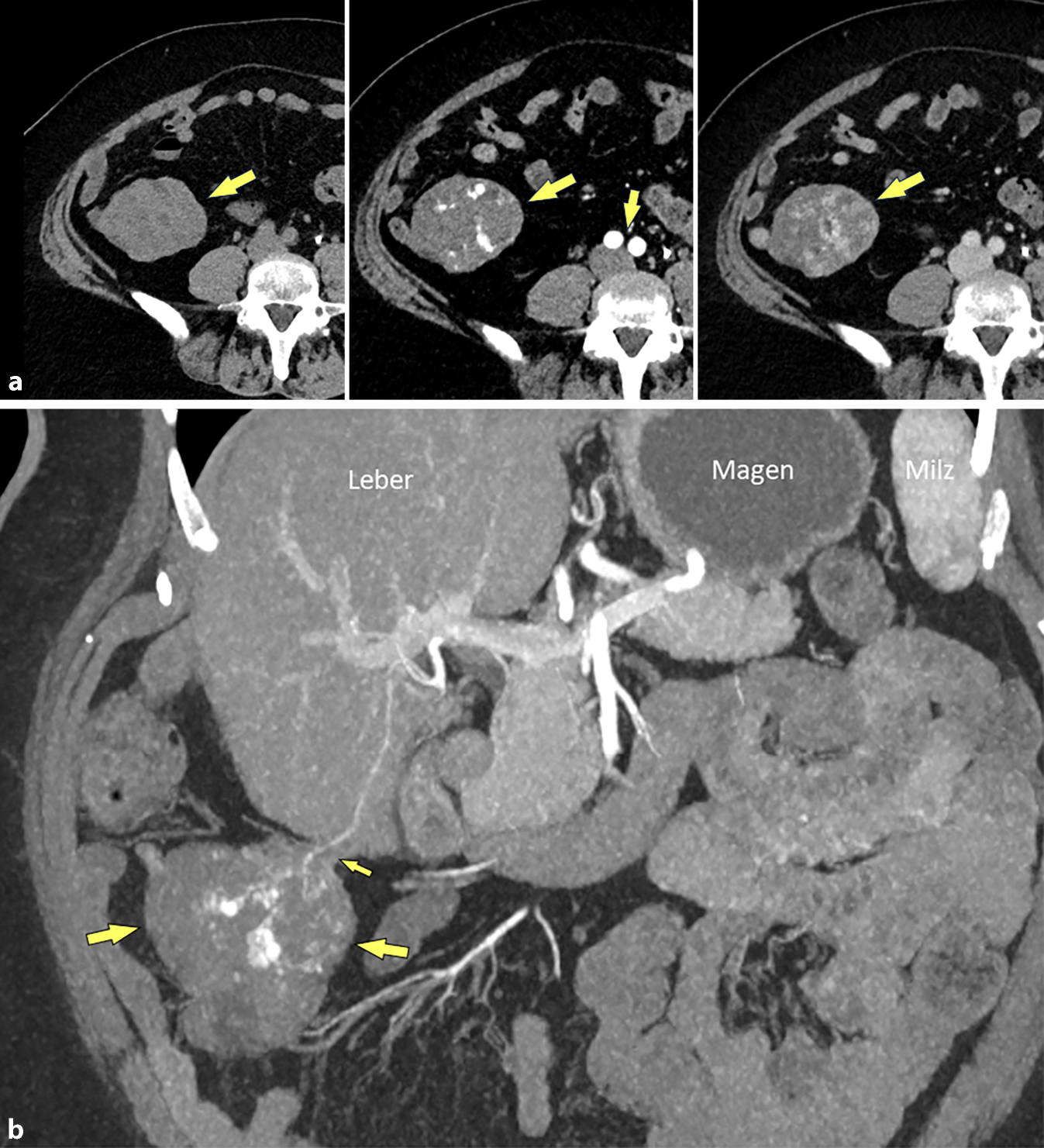 Die MRT in coronaler Rekonstruktion (a) zeigt ebenfalls den Gefäßstiel (kleiner Pfeil) und die (initial irreführende) Nahebeziehung zum Darm. Das axiale MR-Bild (b) zeigt die inhomogene Signalintensität des Hämangioms mit regressiven Veränderungen (ein Hämangiom sollte typischerweise homogen hyperintens = signalreich sein)