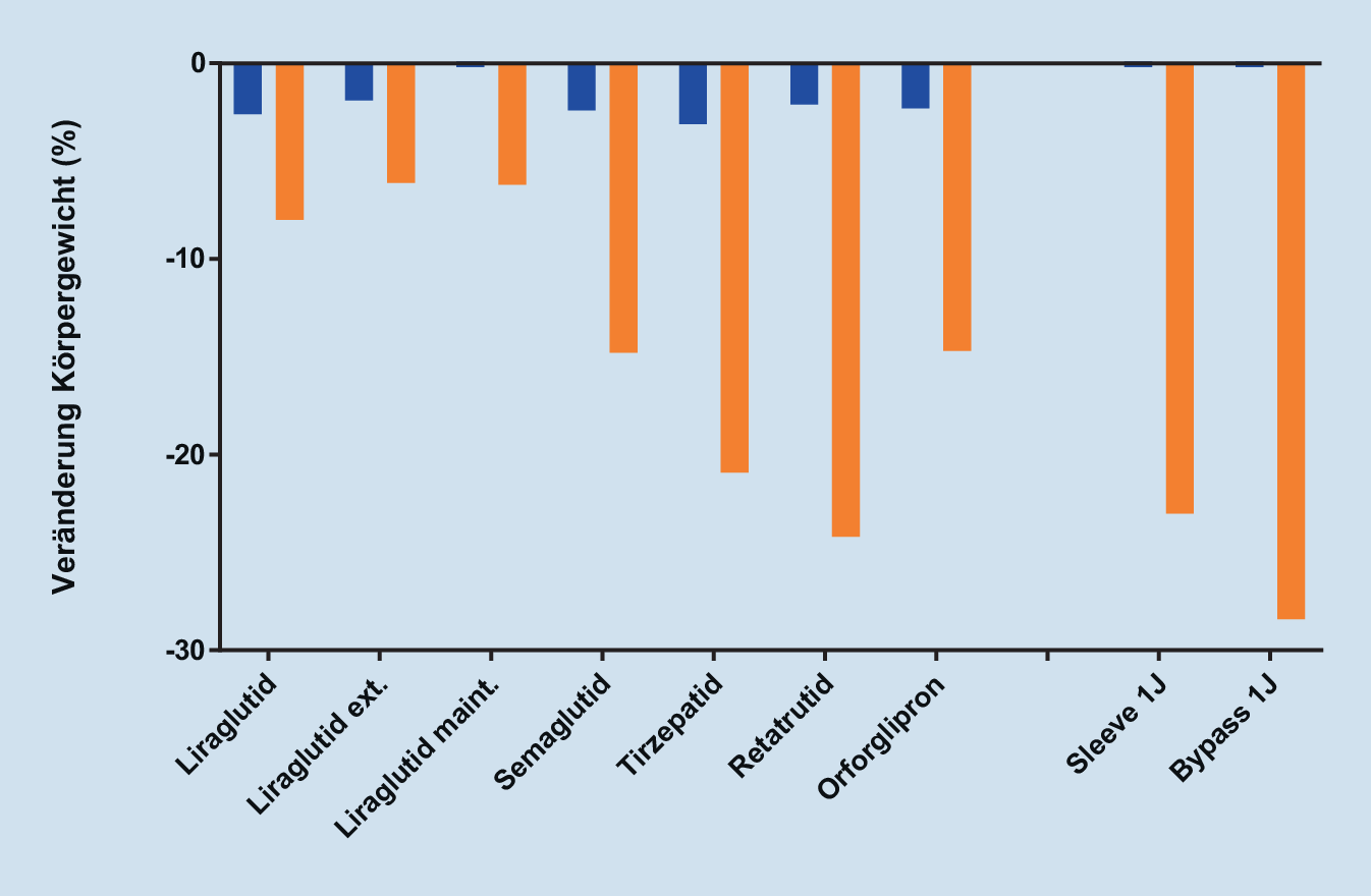 Übersicht über die GLP-1-RA- bzw. inkretinbasierten Therapien: mittlere prozentuale Gewichtsveränderung bei Maximaldosierung in Phase-III- und -II-Studien. Die blaue Farbe steht für die Placebo-, die orange Farbe für die Interventionsarme. Zum Vergleich Daten 1 Jahr nach Sleeve-Gastrektomie und Magenbypass [2]