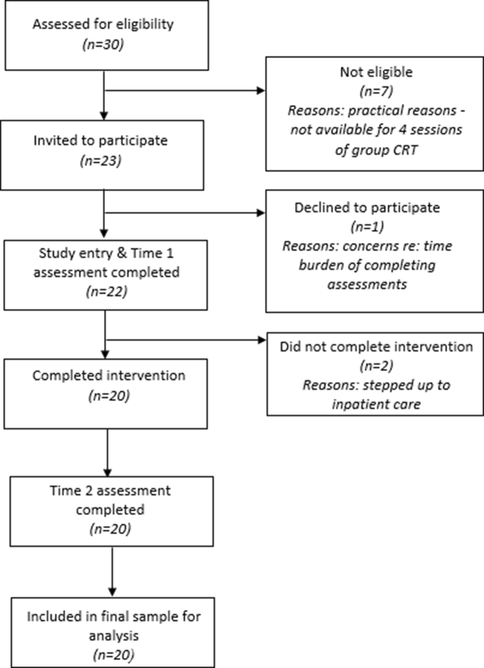 All participants completed the Time 2 assessment following 4 sessions of CRT. Three participants received ‘booster’ individual sessions to help them reach their minimum ‘dose’ due to practical reasons for not making it to the group CRT; of these, 2 participants received their 4th session only as an individual CRT session, and 1 participant received 2 individual sessions. Four participants had received CRT in previous treatment settings, and 2 participants completed up to 4 sessions of CRT prior to their time 1 assessment.