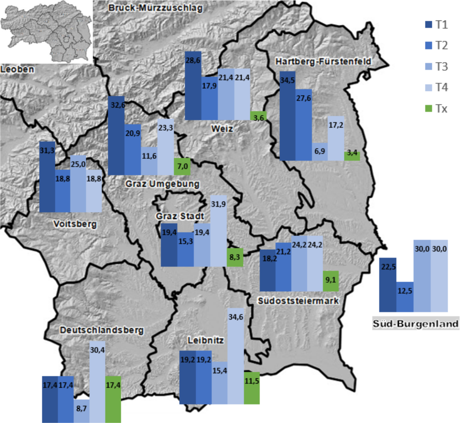 Catchment area of the Department of Otorhinolaryngology, Head and Neck surgery, Medical University of Graz, CCC Graz.The figure outlines the distribution of T-Classification in percentage (%) within each district in South Styria (grey map). T1–T4 size or direct extent of the primary tumor, Tx tumor cannot be assessed, according to TNM (tumor, node, meatsasis) classification UICC (Union International Contre le Cancer) 7th edition