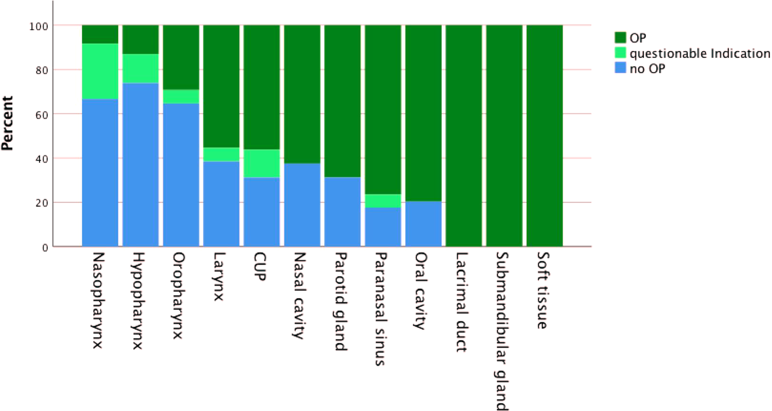 Surgical treatment of patients with head and neck cancer presented at CCC Graz, Medical University of Graz. Blue no surgery was recommended or carried out. Light green surgery options were discussed but finally no surgery was carried out. Dark green surgery was performed. CUP carcinoma of unknown primary, OP operation