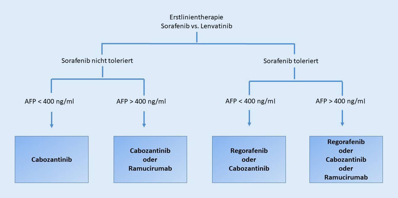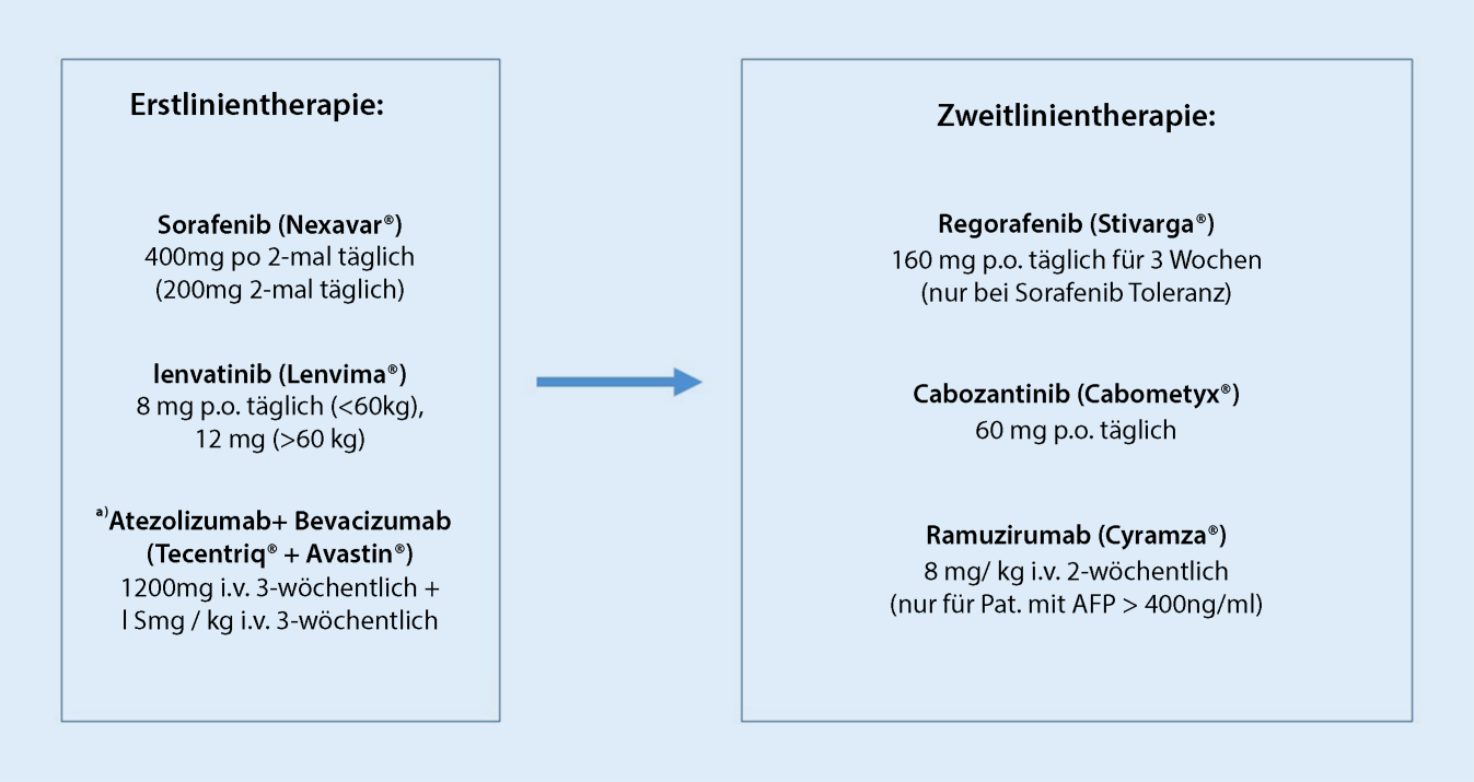Erfreulicherweise konnte in den letzten Jahren das Armamentarium systemischer Therapien in der Behandlung des fortgeschrittenen HCC deutlich erweitert werden. In der Erstlinie steht neben Sorafenib auch Lenvatinib zur Verfügung. Die kürzlich vorgestellten Ergebnisse für die Kombinationstherapie Atezolizumab und Bevacizumab, die signifikant verbesserte Überlebens- und Ansprechraten gegenüber Sorafenib zeigten, lassen schließen, dass diese Kombination den Standard in der Erstlinie in der Zukunft darstellen wird. In der Zweitlinie sind Regorafenib, Cabozantinib und Ramucirumab zugelassen und finden je nach Tyrosinkinaseinhibitorverträglichkeit und α‑Fetoprotein-Wert ihre Verwendung.