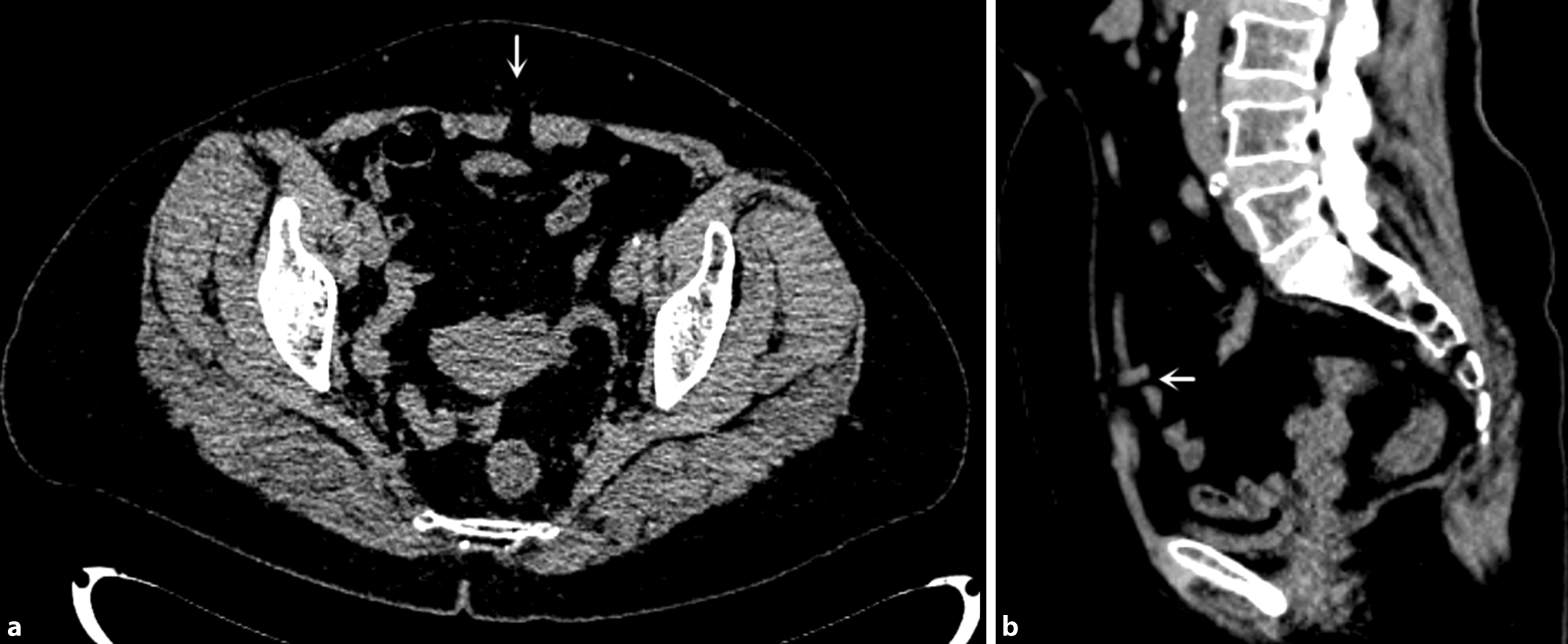 Computed tomography images of a local 0.7-cm defect in the linea alba of the lower abdomen and abdominal fat entering the subcutaneous fat layer through the defect (white arrow)